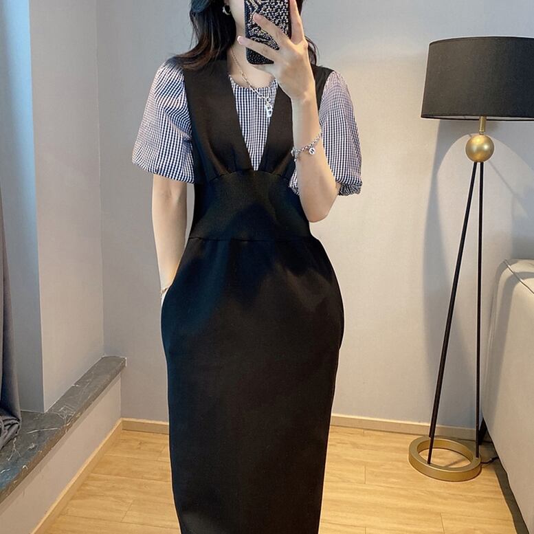 重ね着風ワンピース ワンピース レディース ジャンパースカートワンピース ジャンスカ風ワンピース フェイクレイヤード ドレス ジャンパースカート チェック柄トップス ツーピース風 ロングワンピース 半袖 パフスリーブ ミモレ丈 ハイウエスト 黒 ブラック 大人可愛い きれいめ 上品 エレガント フォーマル ガーリー 春 夏 秋 冬 二次会 お呼ばれ オフィス ビジネス OL 通勤 学生 通学 デート お出かけ パーティー イベント 女子会 体型カバー 普段使い トレンド ゆったり インスタ映え