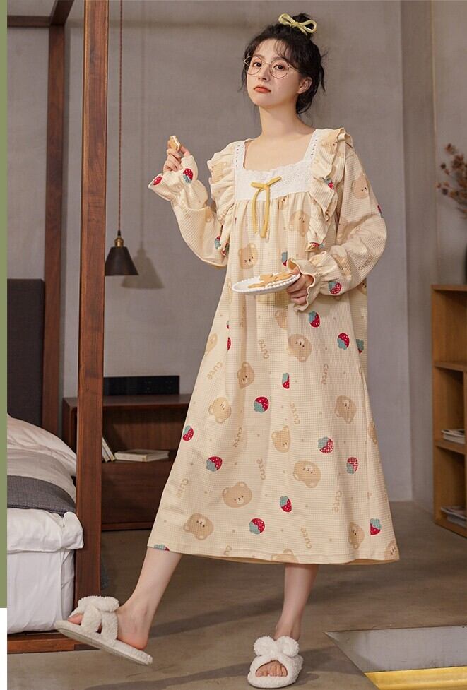 ルームウェア レディース ナイトドレス ネグリジェ パジャマドレス パジャマ ワンピース M L XL 2XL 3XL 4XL 大きいサイズ プラスサイズ ベア くま 熊 クマ イチゴ いちご 苺 パステルカラー 長袖 スクエアネック フリル レース リボン 柄 部屋着 リラックス ミドル丈 ミドル ミモレ丈 ロング丈 膝下 フレア Aライン ゆったり ゆる ルーズ 体型カバー フェミニン ナチュラル キュート ガーリー レトロ 大人 大人可愛い 存在感 主役級 デート 休日 お泊り 韓国 オルチャン
