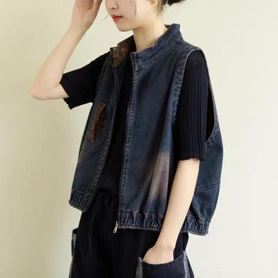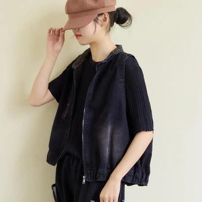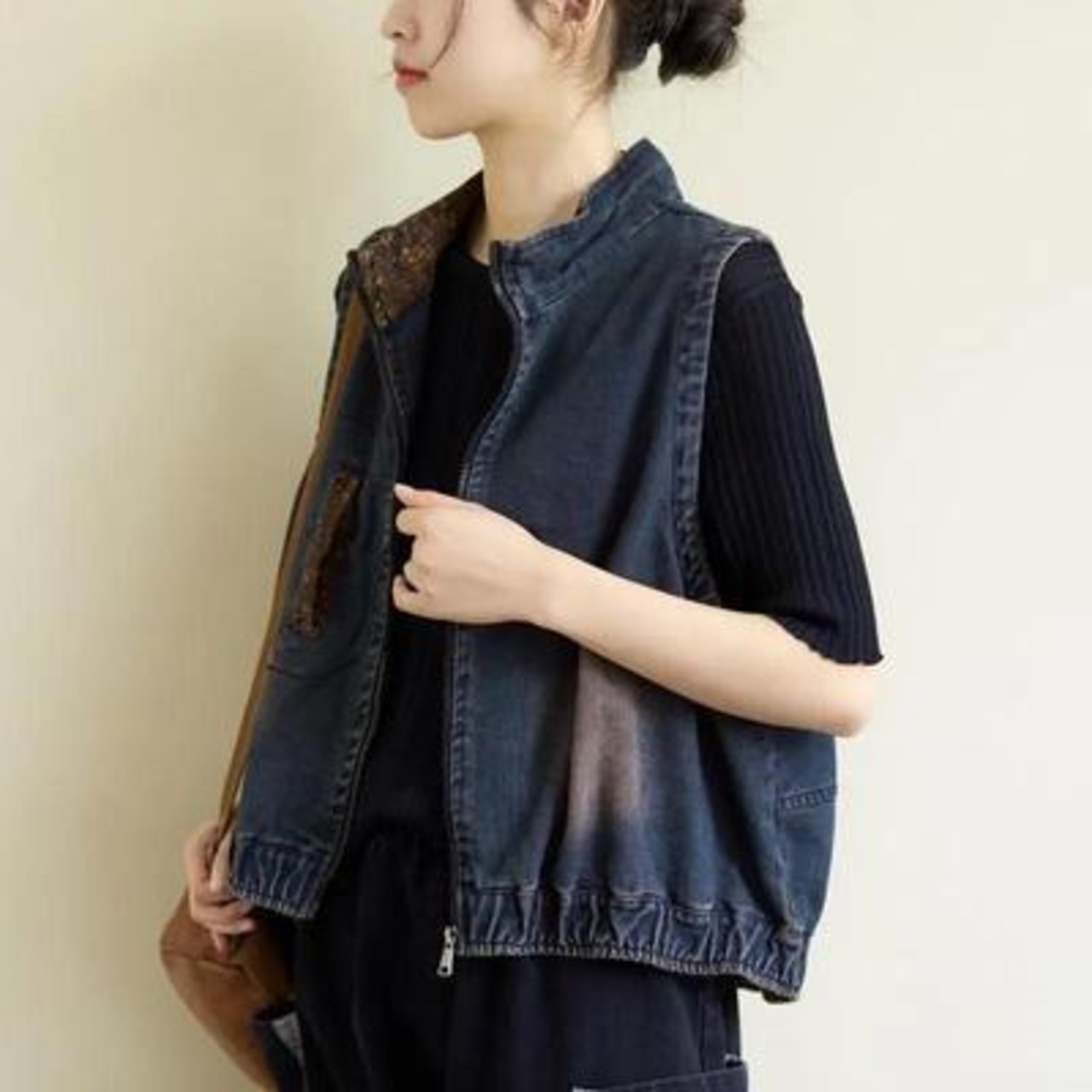 デニム ベスト 前開き レディース 春 夏 秋 ジレ アウター トップス ブリーチ 色落ち クール かっこいい きれいめ ボーイッシュ 大きいサイズ 大きめ ゆったり М L XL 2XL 3XL オシャレ お洒落 ギャザー レトロ アンティーク ヴィンテージ シンプル カジュアル 個性派 個性的 30代 40代 50代 体型カバー 細見え ワイド 着痩せ ブルー 青 ブラック 黒 ファスナー スタンドカラー ノースリーブ こなれ感 重ね着 ダメージ