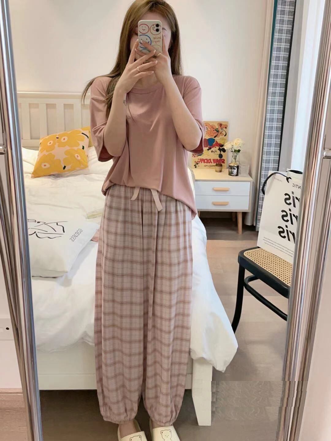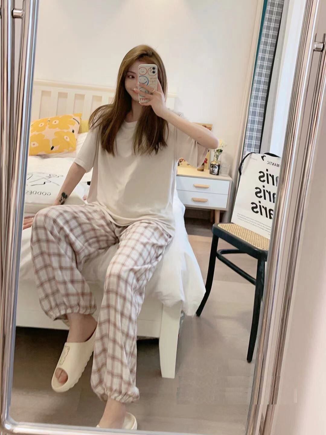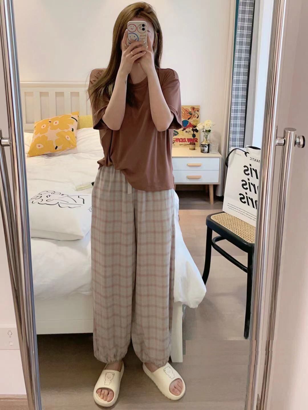 ルームウェア パジャマ レディース ナイトウェア 部屋着 寝巻 袖あり 半袖 上下セット 2点セット Tシャツ チェックパンツ ラウンドネック かわいい シンプル カジュアル おしゃれ お洒落 こなれ感 ラフ ルーズ 抜け感 リラックス フリーサイズ ワンサイズ アイボリー ブラウン 茶色 ピンク グリーン 緑 無地 チェック柄 夏 10代 20代 30代 40代 50代 60代 ママ お泊り 休日 旅行 プレゼント ギフト 定番 普段使い お揃い 双子 オルチャン 韓国 楽ちん