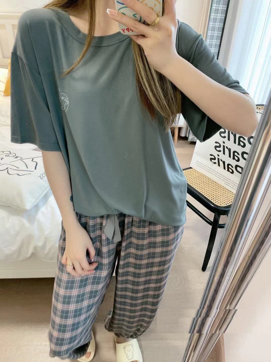 半袖Tシャツとチェックロングパンツの上下パジャマセット。