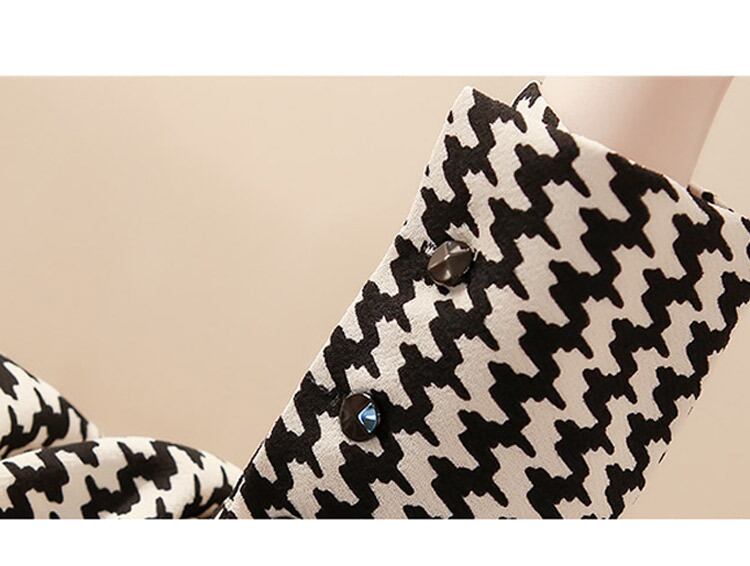 モノトーンの千鳥格子柄の長袖トップスと膝丈スカートのセットアップ。