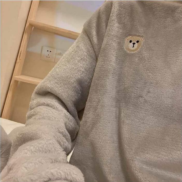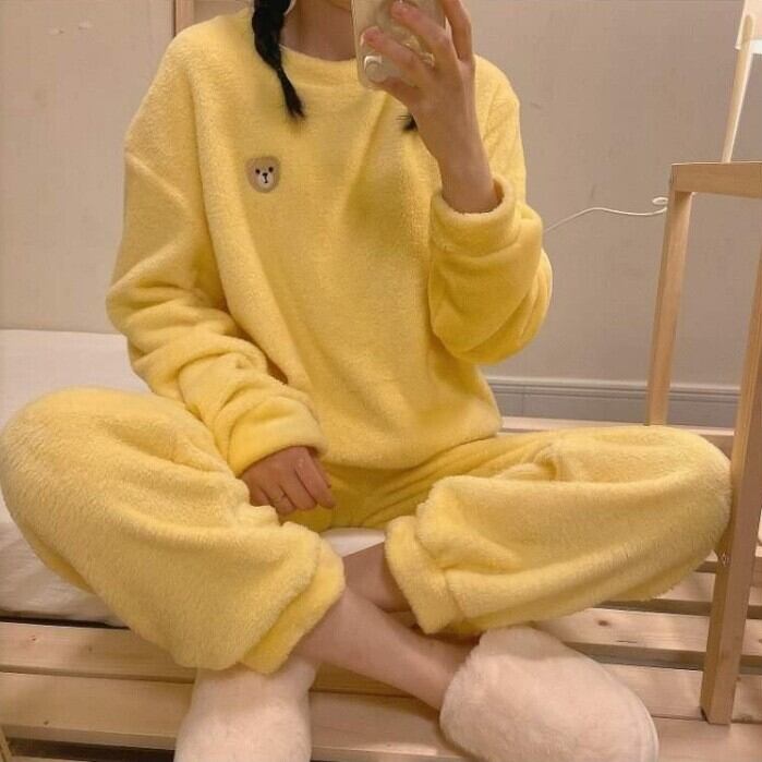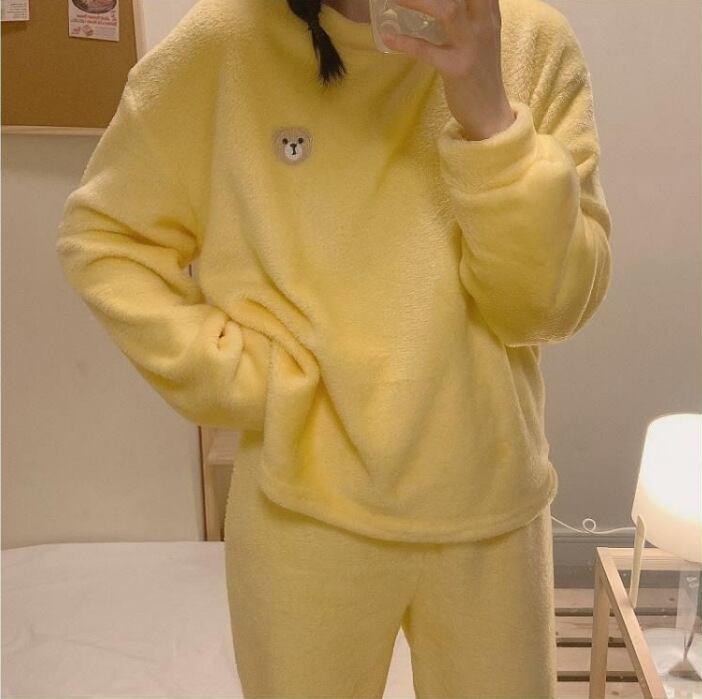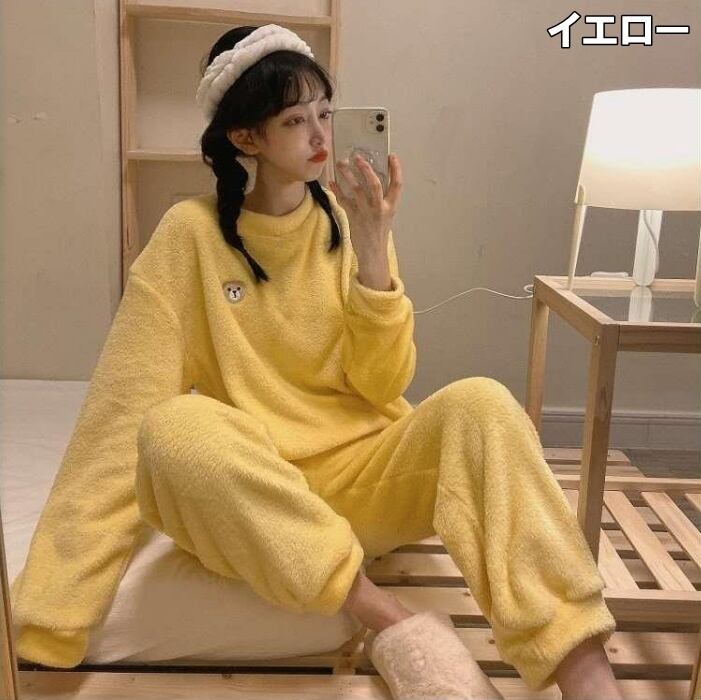 ルームウェア レディース パジャマ 部屋着 2点セット 上下セット セット パンツ 長ズボン M L XL 2XL イエロー 黄色 グレー 灰色 ワンポイント もこもこ ふわふわ 秋 冬 あったか くま クマ 熊 ベア 大人カラー 長袖 クルーネック リラックス ドロップショルダー ロング丈 ロング ゆったり ゆる ルーズ くすみカラー 体型カバー 着やせ ナチュラル ガーリー フェミニン キュート レトロ 大人可愛い 大人 お泊り 存在感 主役級 シンプル ベーシック 定番 王道 学生 韓国 オルチャン