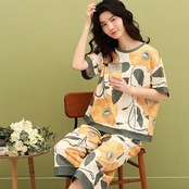 パジャマ 上下セット 花柄 レディース 半袖 ラウンドネック 七分丈 フラワー 総柄 ゆったり 大きめ 大きいサイズ М L XL 2XL 夏 春 緑 グリーン 黄色 イエロー きれいめ 上品 エレガント かわいい 大人可愛い 大人女子 高級感 薄手 シンプル カジュアル ラフ ルームウェア 部屋着 寝巻 リラックス パンツ ズボン 長ズボン 九分丈 20代 30代 40代 50代 レトロ エキゾチック 綿 コットン 通気性 こなれ感 大人女子 ウエストゴム 旅行 お泊まり