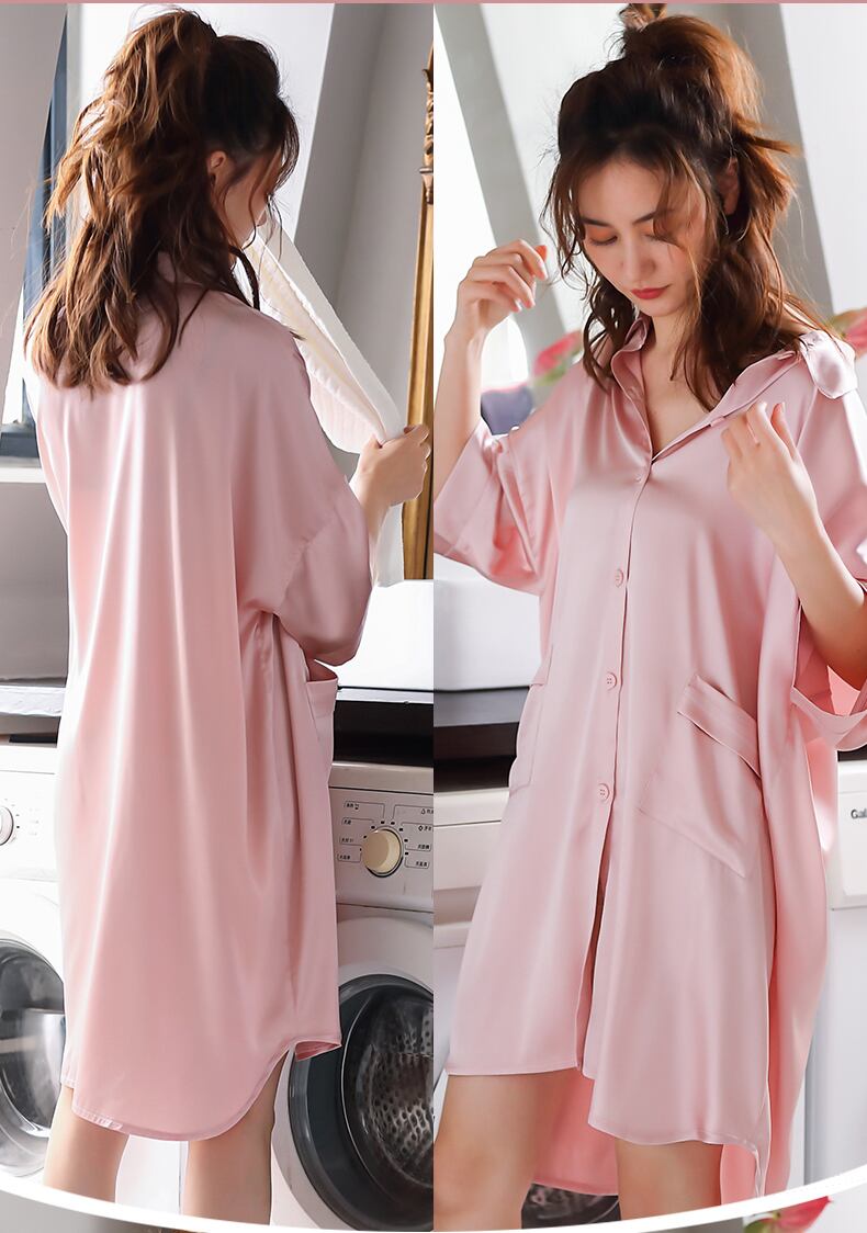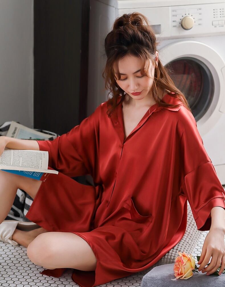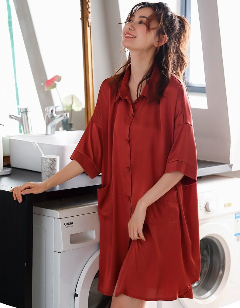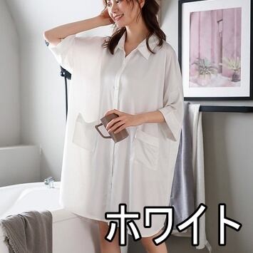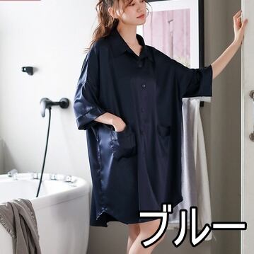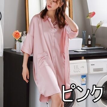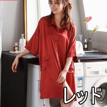 パジャマ ワンピース 4色 半袖 レディース シャツワンピース 光沢 五分袖 七分袖 無地 膝丈 膝下 ゆったり 大きめ 大きいサイズ М L XL 2XL 3XL 体型カバー 細見え 着痩せ 赤 レッド 白 ホワイト ピンク 青 ブルー ネイビー リラックス ルームウェア 寝巻 部屋着 彼シャツ モテ セクシー 旅行 お泊まり 20代 30代 40代 50代 オープンカラー 前開き ポケット ボタン オシャレ お洒落 かわいい 大人可愛い 双子 お揃い 色違い SNS 映え プレゼント ギフト 春 夏