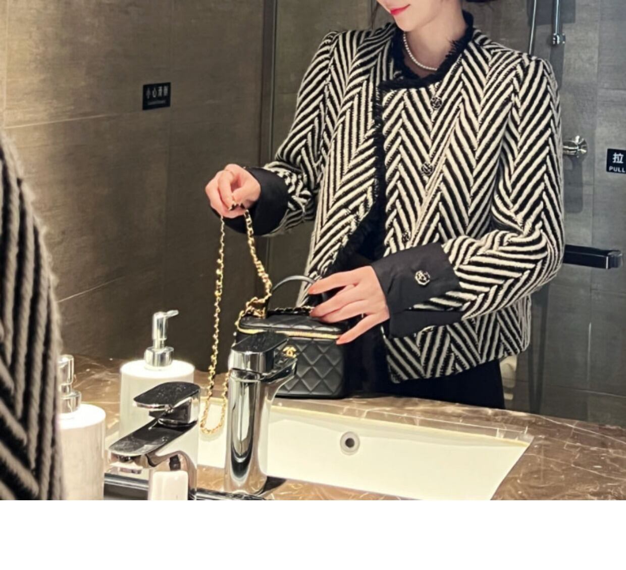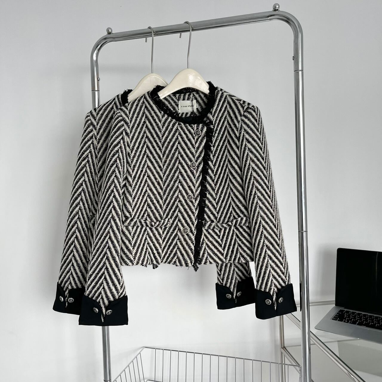 モノトーンのヘリンボーンストライプノーカラージャケット。