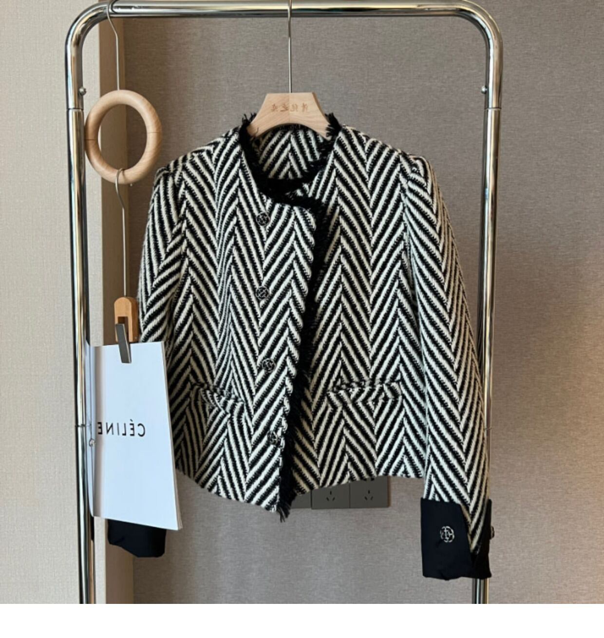 アウター レディース ジャケット ノーカラージャケット ショートコート ショート丈 ポケット ボタン フリンジ 袖あり 長袖 襟なし ヘリンボーンストライプ柄 斜めストライプ きれいめ シンプル 大人 上品 おしゃれ お洒落 かっこいい 大人女子 クールモード系 存在感 M L 黒 ブラック モノトーン 春 秋 20代 30代 40代 50代 ママ オフィス ビジネス OL 通勤 学生 通学 デート お出かけ 女子会 休日 パーティー イベント 旅行 プレゼント ギフト 着回し 重ね着