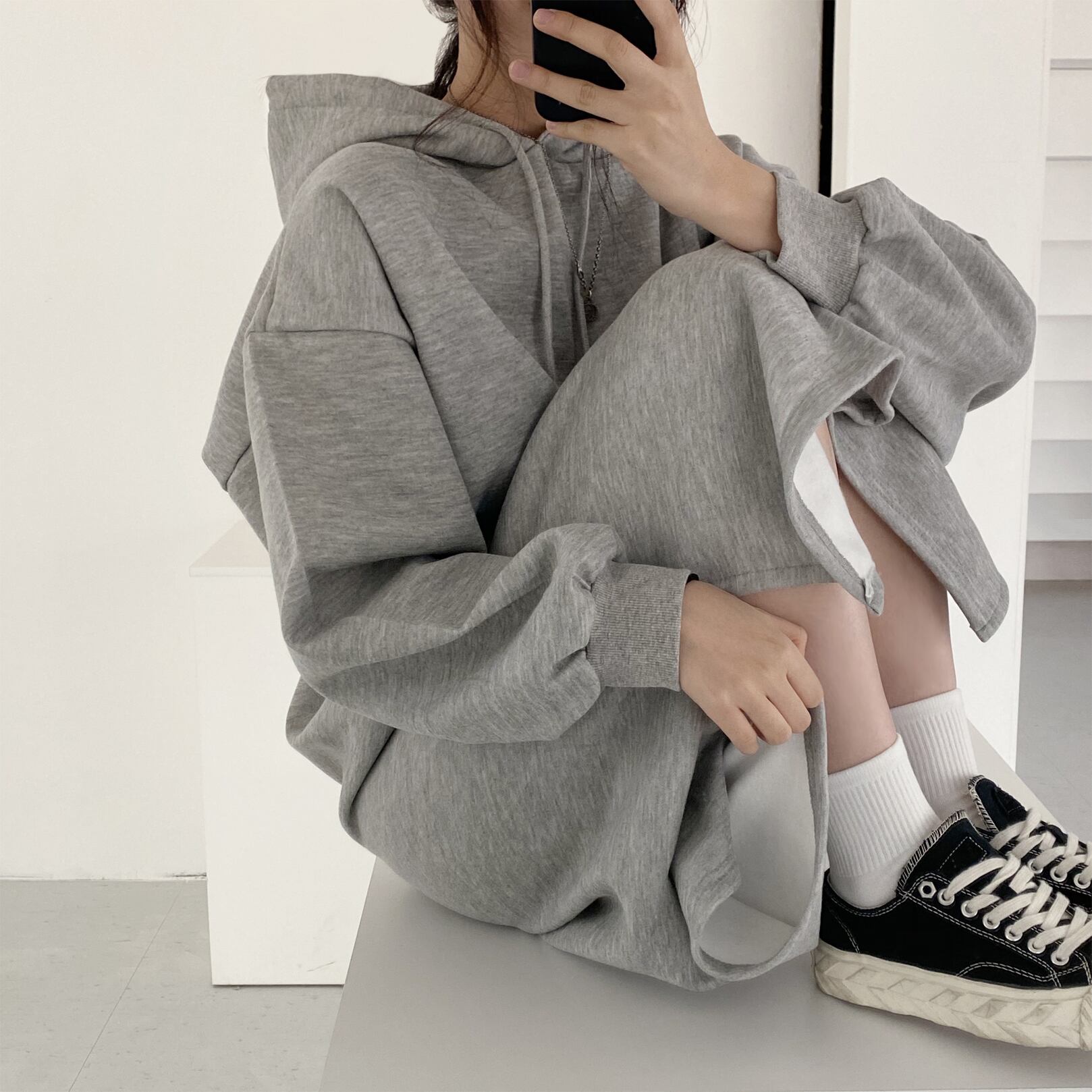 ワンピース ロング丈 パーカー 長袖 レディース パーカーワンピース ランタンスリーブ フード ストレート Iライン オーバーサイズ 大きめ ゆったり 体型カバー 着痩せ 細見え 無地 シンプル カジュアル オシャレ お洒落 かわいい 大人可愛い スリット 黒 ブラック グレー 灰色 膝下 ミモレ丈 春 秋 冬 ラフ こなれ感 20代 30代 40代 部屋着 ルームウェア クール ルーズ 重ね着 小顔 美脚 トレンド 韓国 お出かけ 買い物