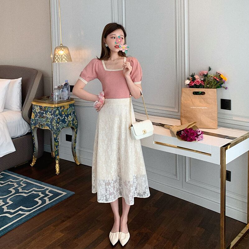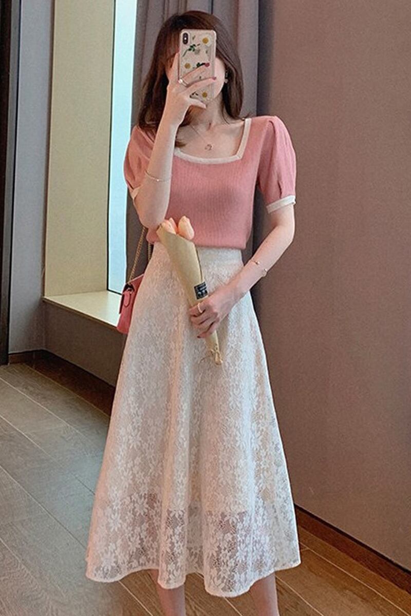 2点セット ツーピース トップス スカート デート レース カットソー フレアスカート ミモレ ミモレ丈 袖あり 半袖 スクエアネック 襟なし フレア Aライン 裾イン レース 上下セット お得 かわいい きれいめ 上品 おしゃれ 大人女子 こなれ感 ラブリー キュート ガーリー エレガント 柄 花柄 小花柄 フラワー レディース ビジネス OL 通勤 着回し 韓国 オルチャン モテ S M L XL 白 ホワイト オフホワイト ピンク パステルカラー 春カラー