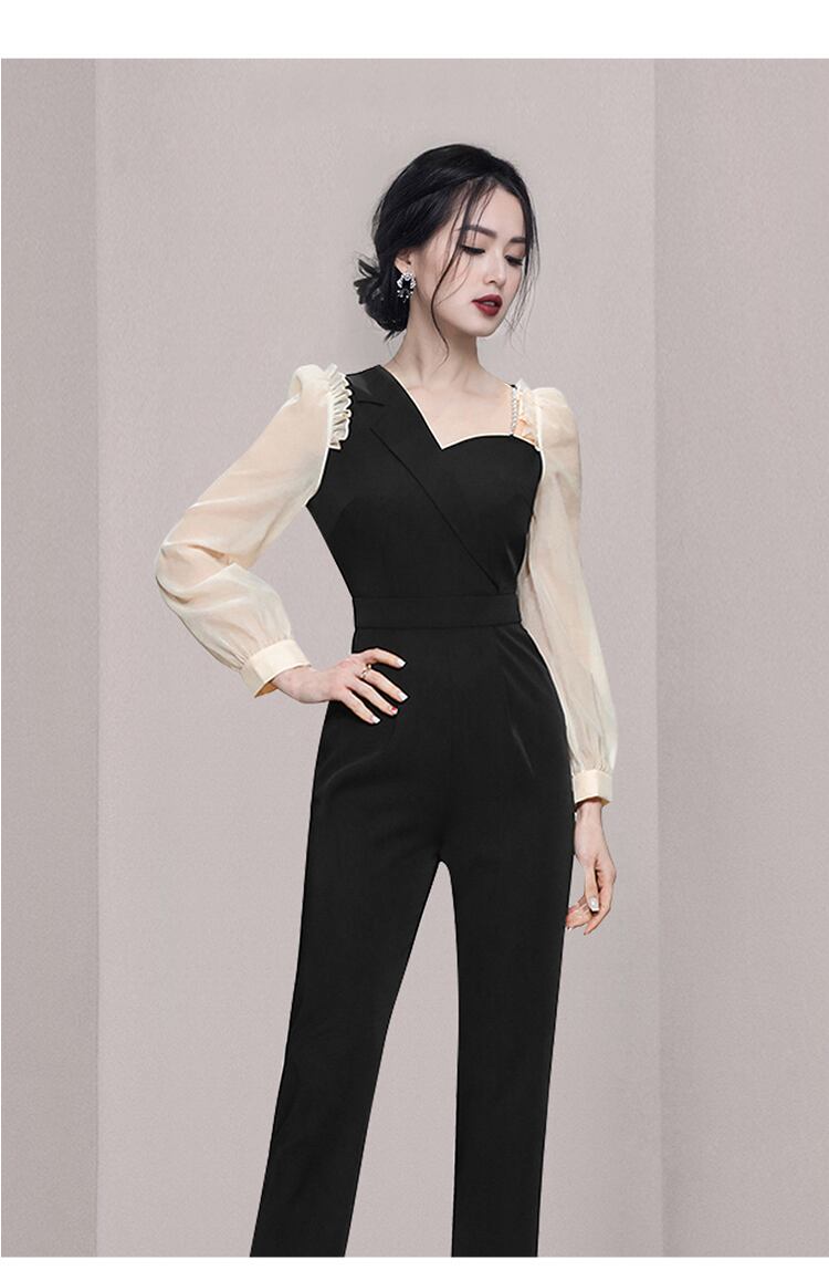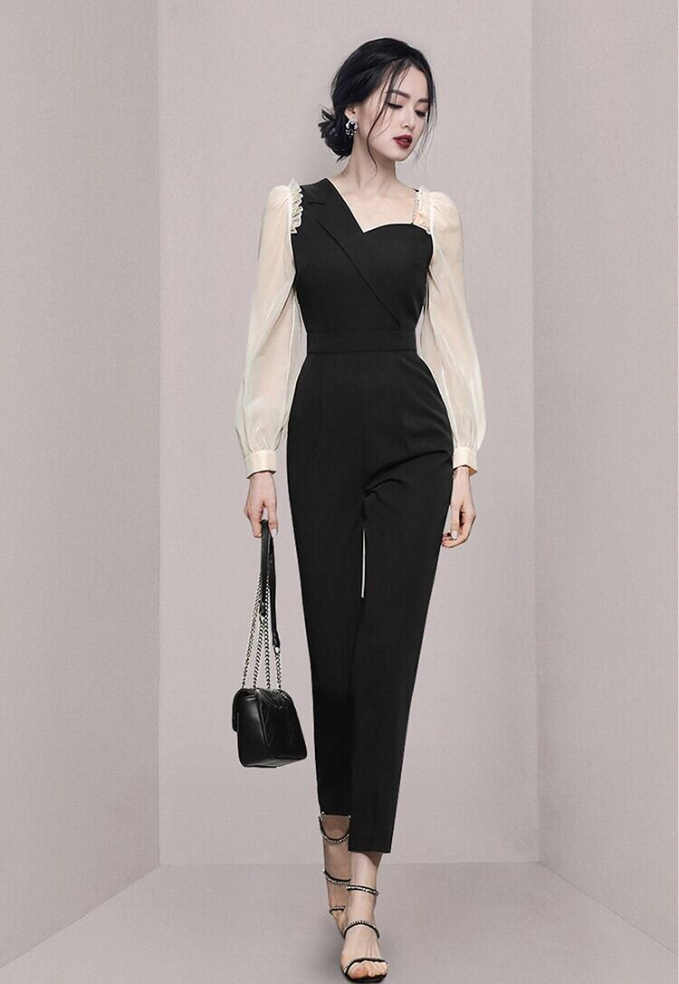 オールインワン レディース ジャンプスーツ サロペット パンツドレス パーティードレス ドレス パンツ S M L XL ブラック 黒 大人カラー 無地 春 夏 長袖 シアースリーブ 透け感 シースルー アシンメトリー ストレート ハイウエスト アンクル丈 脚長 体型カバー 着やせ 美ライン 美シルエット ママ 上品 エレガント エレガンス モード スタイリッシュ モノトーン 華やか きれいめ パーティー 1.5次会 2次会 大人 大人可愛い 存在感 主役級 謝恩会 こなれ感 ぬけ感 韓国 オルチャン