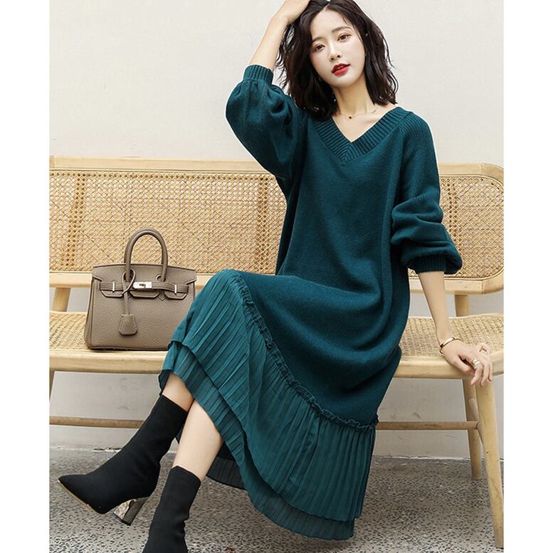 裾プリーツ切り替えVネックロングニットワンピース ワンピース レディース ニットワンピース ロングワンピース 裾プリーツ 切り替え 異素材 ドッキング ニット ドレス Vネック ボリュームスリーブ 長袖 バルーンスリーブ フェミニン 緑 黒 赤 グリーン ブラック レッド 大人可愛い きれいめ 上品 エレガント フォーマル ガーリー ルーズ 春 夏 秋 冬 二次会 お呼ばれ オフィス 通勤 通学 デート お出かけ イベント 女子会 体型カバー オーバーサイズ ゆったり 大人カラー