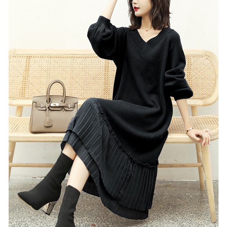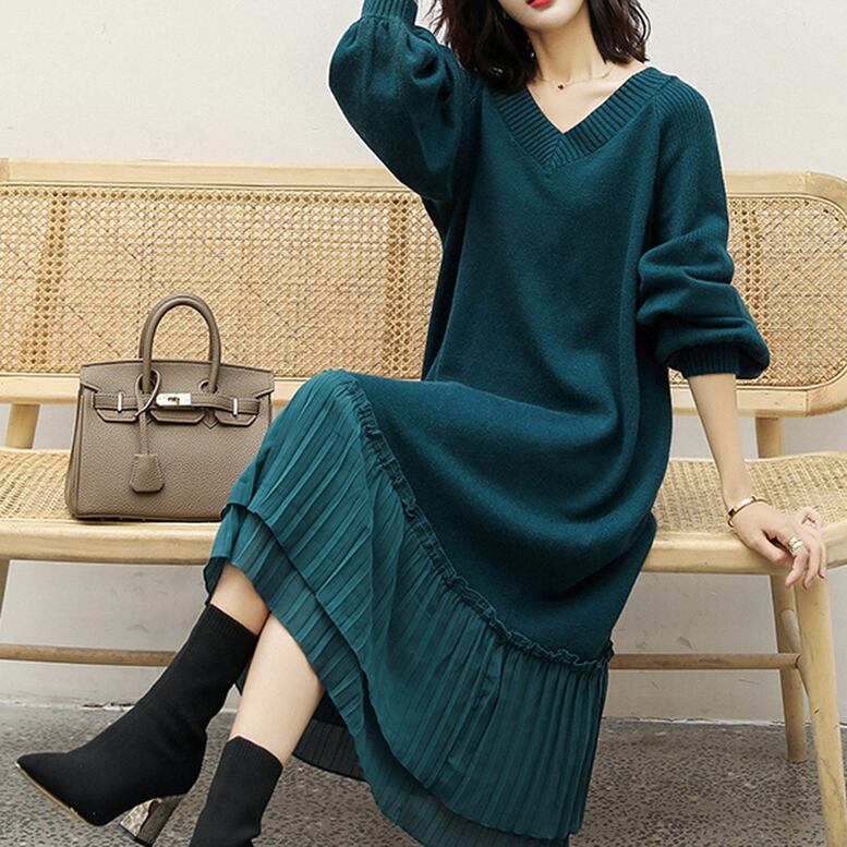裾をプリーツに仕立てたエレガントなニットワンピース