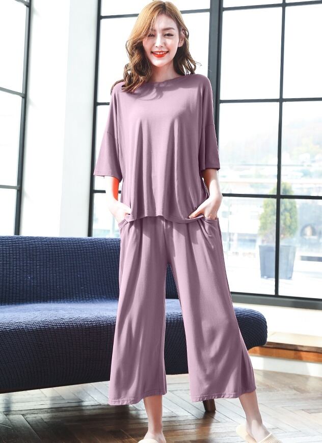 パジャマ 8色 半袖 上下セット レディース 無地 7分丈 ラウンドネック くすみカラー ゆったり 大きめ 大きいサイズ ラフ L XL シンプル カジュアル 2点セット 赤 レッド オレンジ ブラウン ベージュ 紫 パープル グリーン 緑 ブルー 青 ブラック 黒 グレー 灰色 薄手 部屋着 寝巻 ルームウェア リラックス パンツ ロング丈 旅行 お泊まり 色違い お揃い SNS 双子 春 夏 通気性 ギフト プレゼント お洒落 オシャレ かわいい 大人可愛い 柔らか 20代 30代 40代 50代
