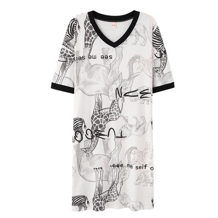 ルームウェア Vネック ワンピース 半袖 レディース 動物 アニマル ボーダー ストライプ 白黒 モノクロ 膝丈 ワイド 5分袖 ゆったり 大きめ 大きいサイズ М L XL 2XL 3XL 体型カバー 着痩せ 細見え 寝巻 部屋着 ネグリジェ パジャマ リラックス Iライン ストレート シンプル カジュアル 個性派 個性的 お洒落 オシャレ かわいい 大人可愛い こなれ感 20代 30代 40代 50代 春 夏 薄手 通気性 旅行 お泊まり ギフト プレゼント デコルテ 鎖骨 セクシー