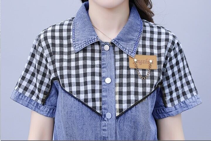 ワンピース デニムワンピース ショート ショート丈 膝上 袖あり 半袖 Vネック 襟付き 角襟 スリム Iライン ドッキング ウエストマーク ウエストリボン ドッキング かわいい カジュアル おしゃれ こなれ感 ラフ スポーティー キュート 個性的 主役級 チェック柄 レディース デート お出かけ 公園デビュー 休日 イベント モテ 美脚 脚長 M L XL 2XL 3XL 4XL 5XL 大きいサイズ 白 ホワイト 黒 ブラック 青 ブルー 茶色 ブラウン