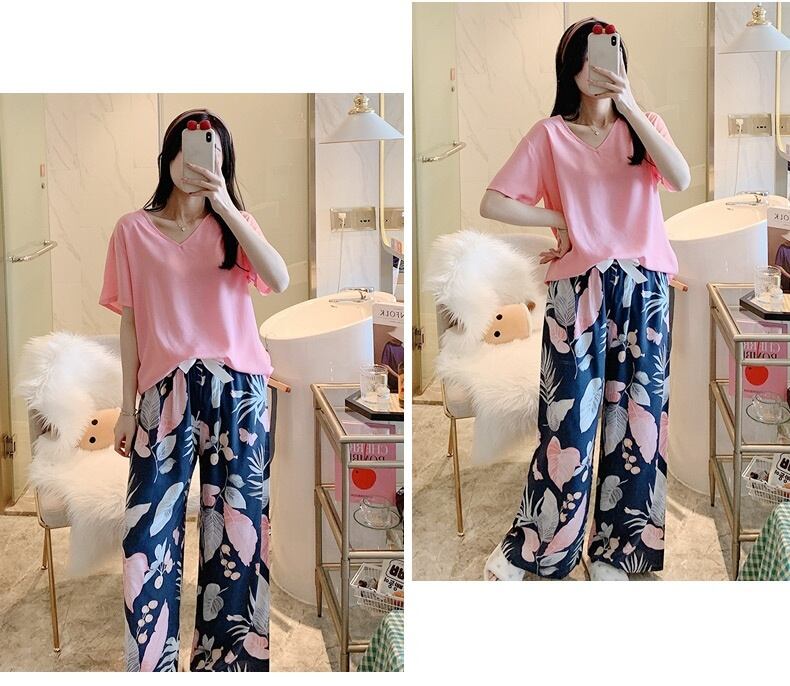 パジャマ ルームウェア 上下セット レディース 花柄 フラワー 半袖 パンツ ズボン ロング丈 ラウンドネック 春 夏 秋 長ズボン 無地 ウエストリボン ウエスト調節 調整 Vネック 薄手 エレガント 上品 高級感 きれいめ かわいい 大人可愛い お洒落 オシャレ 黄色 イエロー ピンク 青 ブルー ネイビー 総柄 着回し ゆったり 大きめ М L 寝巻 部屋着 リラックス 2点セット 体型カバー ストレート Iライン 旅行 お泊まり ギフト プレゼント くすみカラー パステルカラー