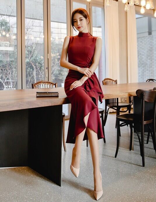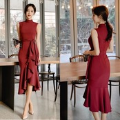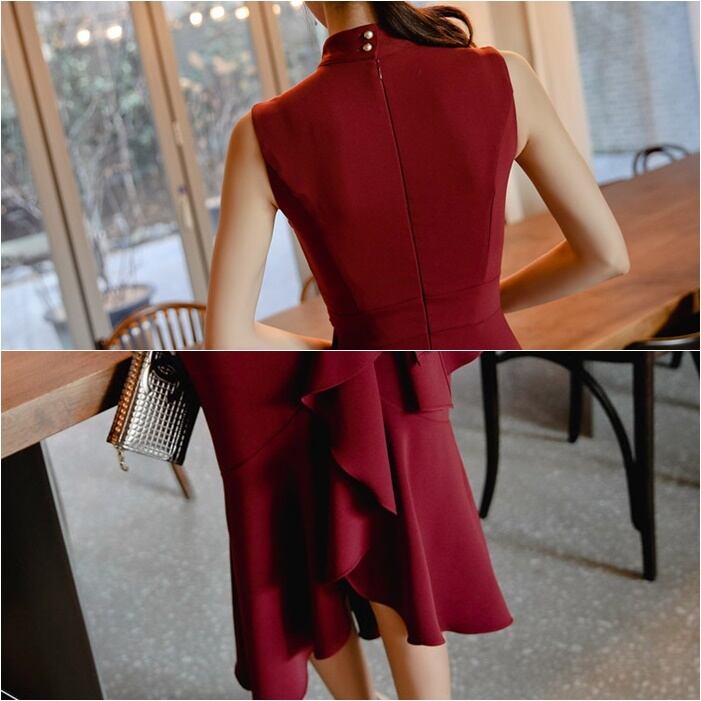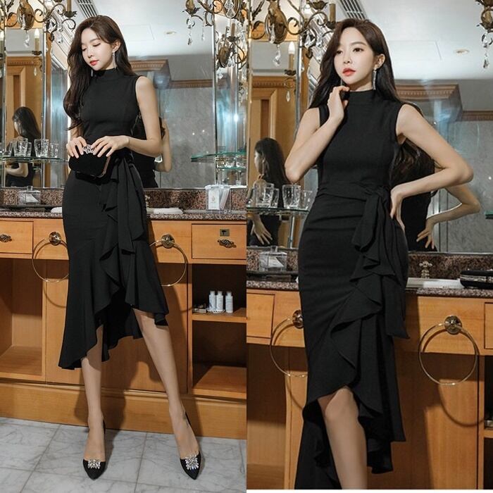 ドレス レディース パーティードレス ミディドレス ワンピース S M L XL ワインレッド 赤 ブラック 黒 大人カラー 秋カラー フリル アシンメトリー ウエストベルト リボン マーメードライン ハイネック タートルネック ノースリーブ タイト ぴったり 美ライン 美シルエット ミドル丈 ミドル ミディ丈 ミディ 膝丈 ハイウエスト 美脚 脚長 フェミニン 大人 大人可愛い 上品 エレガント シック 華やか 存在感 主役級 パーティー 2次会 1.5次会 女子会 謝恩会 お呼ばれ 韓国 オルチャン