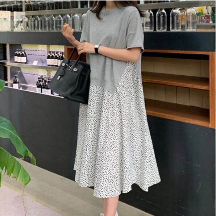 夏 ミドル フェイクツーピース スカート ワンピース プルオーバー ミディスカート ワンピドレス ミドル丈 袖あり 半袖 ラウンドネック 襟なし フレア アシンメトリー レギュラー フリル ふわふわ 薄手 異素材MIX シンプル お洒落 レトロ エスニック 大人女子 こなれ感 ラフ ラブリー 個性的 モダン 無地 夏 レディース 女性用 ママ オフィス ビジネス OL 通勤 お出かけ お泊まり アウトドア 着回し ファッション インスタ映え XL 2XL 3XL 4XL 5XL ブラック ライトグレー