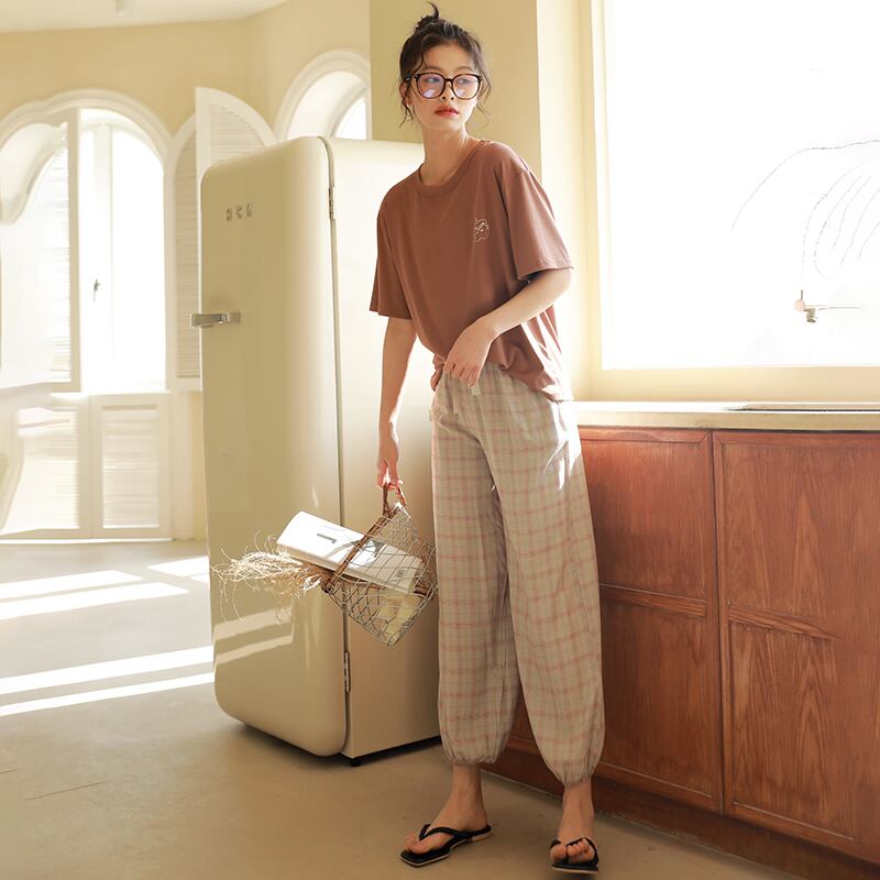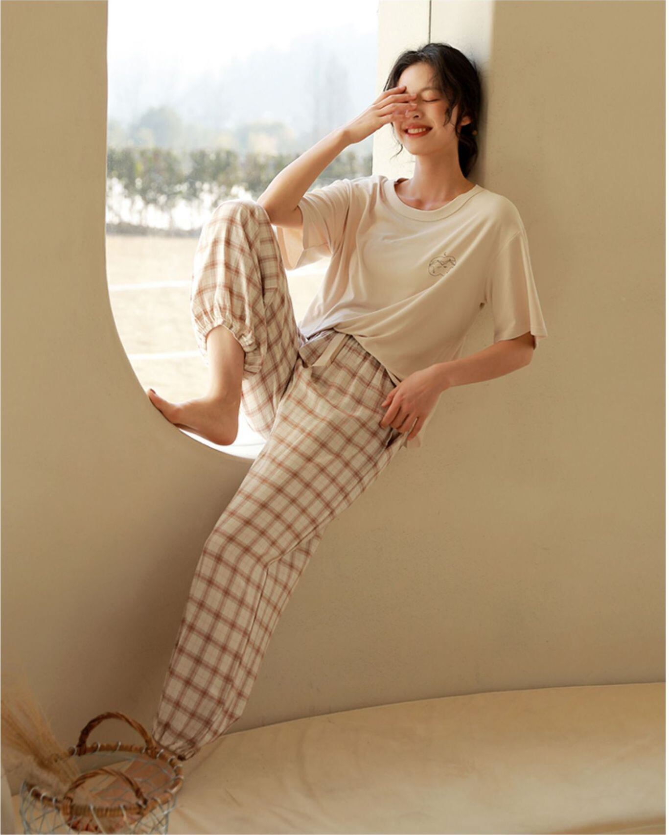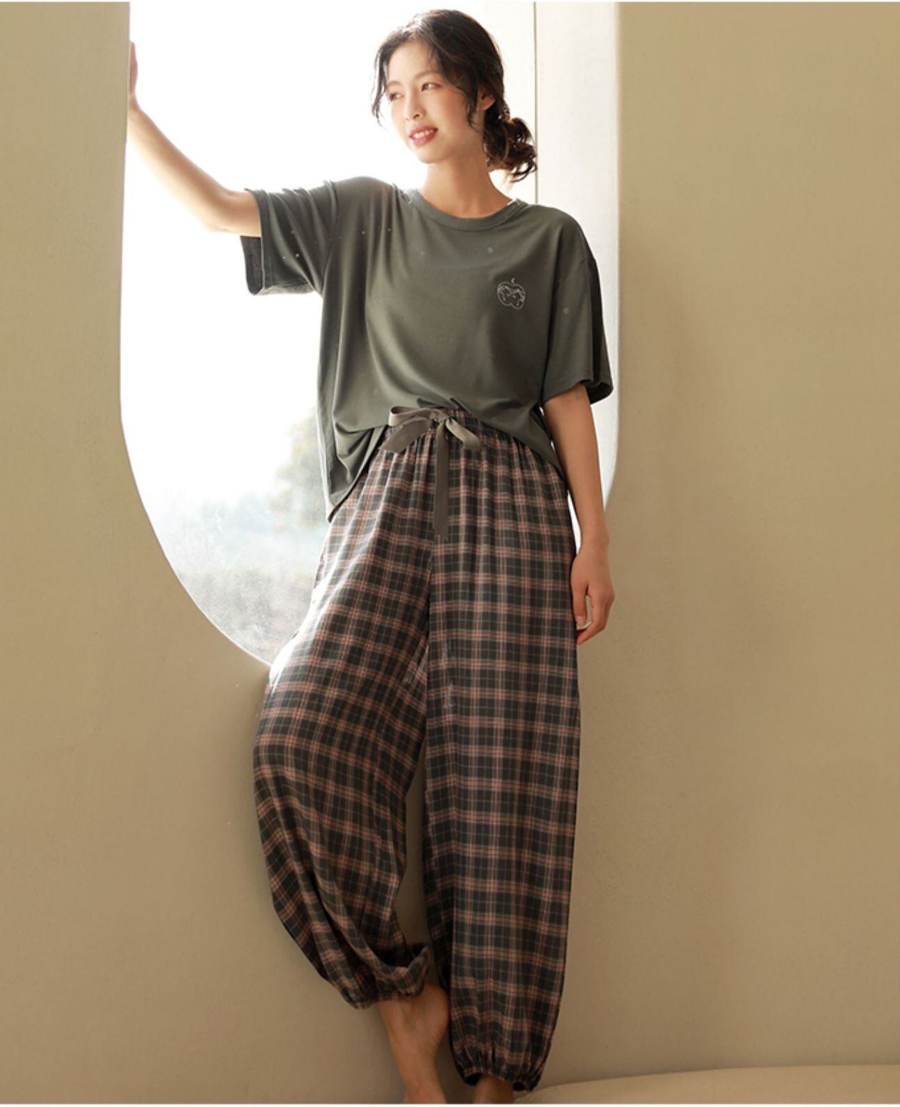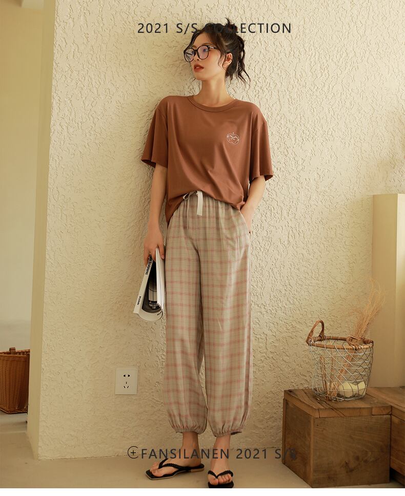 パジャマ ルームウェア レディース ナイトローブ 部屋着 寝巻き ナイトウェア 袖あり 半袖 Tシャツ チェックパンツ ロングパンツ 長ズボン ラウンドネック 2点セット ツーピース 上下セット ワンサイズ フリーサイズ かわいい シンプル カジュアル おしゃれ お洒落 こなれ感 ラフ メンズライク ルーズ リラックス 楽ちん こなれ感 ピンク グリーン 緑 アイボリー ブラウン 茶色 無地 春 夏 秋 10代 20代 30代 40代 50代 60代 ママ お泊り 休日 旅行 リゾート 普段使い お揃い