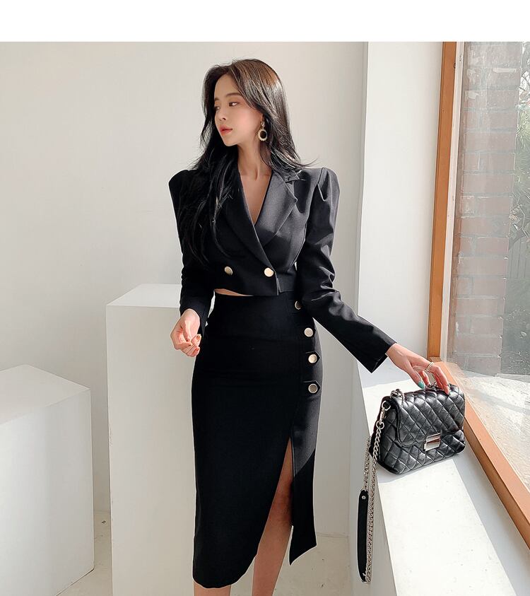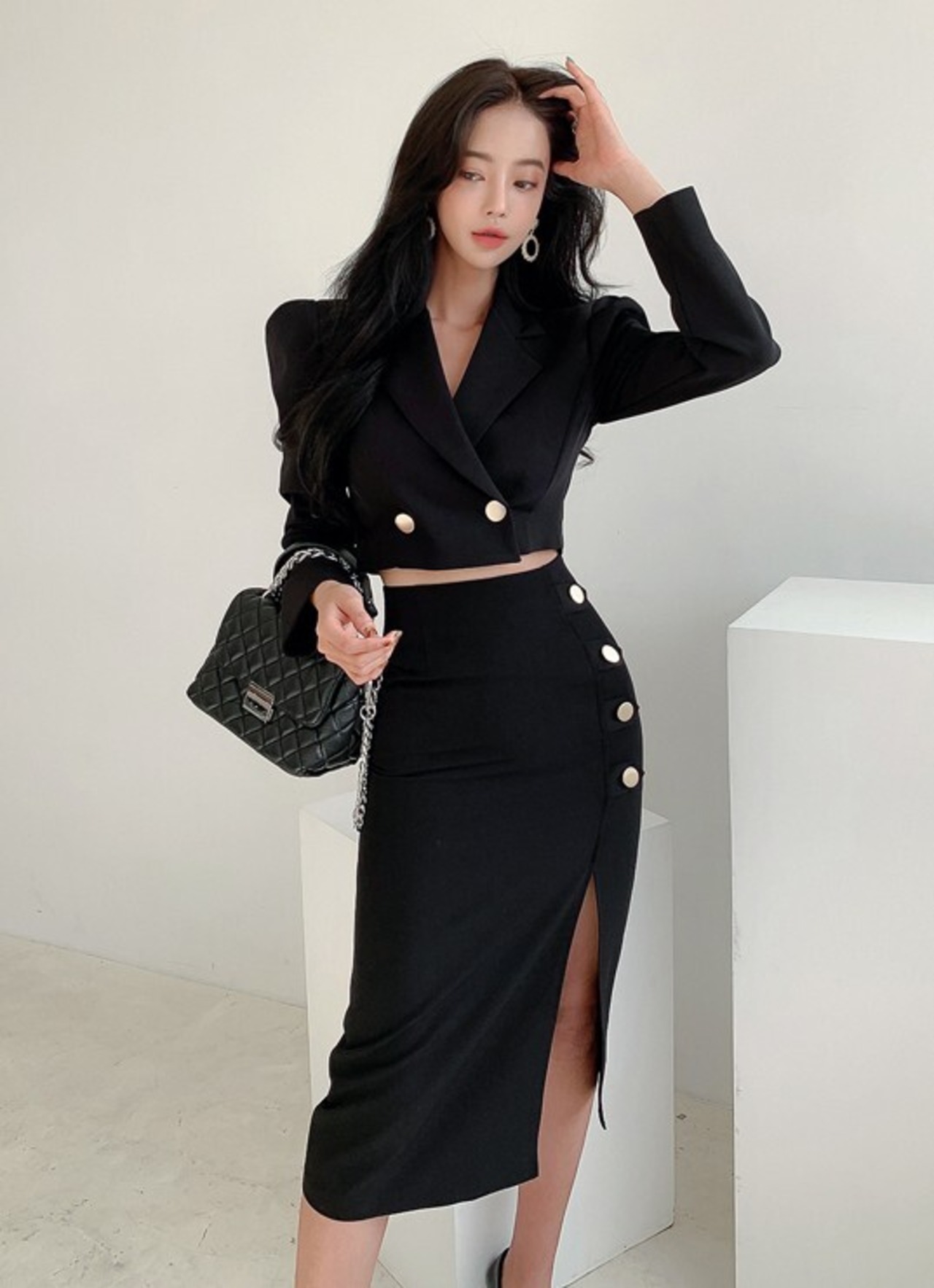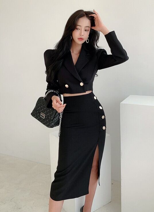 セットアップ レディース セット 2点セット ツーピース S M L XL ブラック 黒 大人カラー トップス ジャケット テーラード Vネック ボタン ショート丈 ショート クロップド丈 長袖 ボトムス スカート ミドル丈 ミドル ロング丈 ロング 膝下 ハイウエスト 脚長 美脚 美ライン 美シルエット スリット タイト ぴったり スリム セクシー ヘルシー 肌見せ スタイルアップ きちんと感 大人 大人可愛い フェミニン 存在感 主役級 スタイリッシュ クール 上品 韓国 オルチャン パーティー