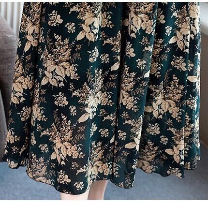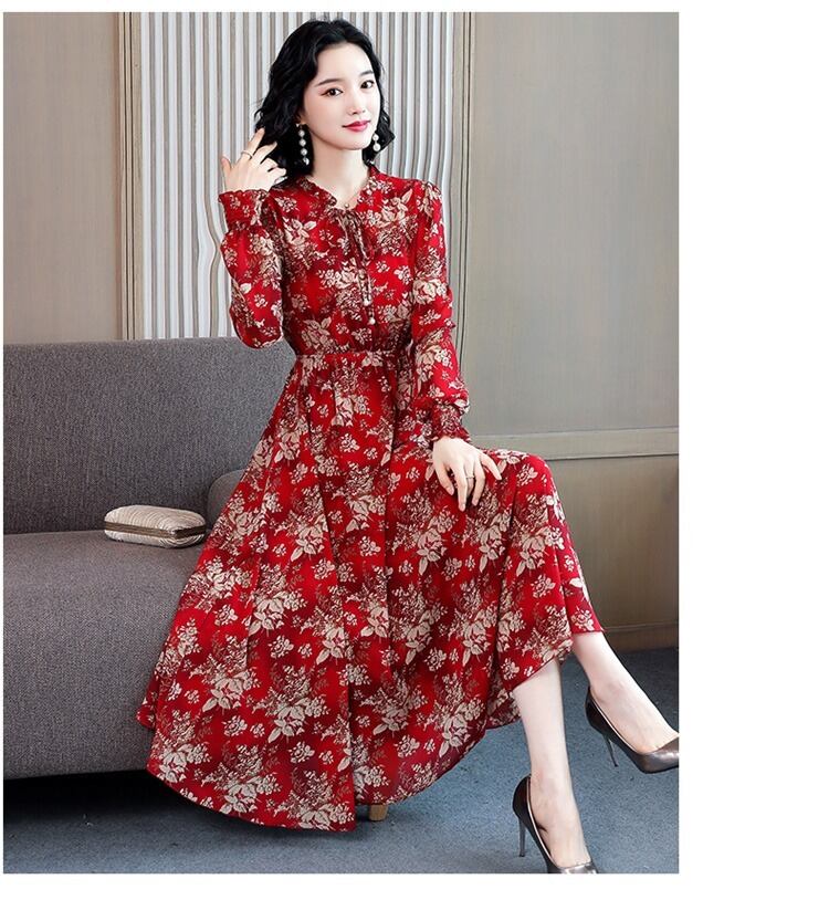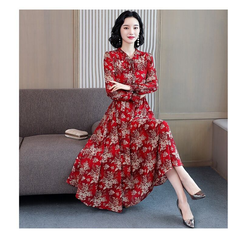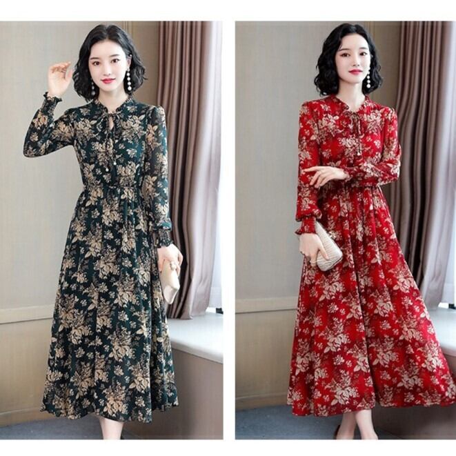 ワンピース フレアワンピース 膝下 ミモレ ミモレ丈 袖あり 長袖 ハイネック 襟なし フレア 切り替えデザイン フリル ウエストマーク 切り替えデザイン ウエストゴム きれいめ 大人 上品 おしゃれ アジアン エスニック 大人女子 こなれ感 個性的 クール セクシー エレガント モダン 主役級 存在感 柄 レディース 女性用 リゾート ホテル レストラン 穴あき 美脚 脚長 M L XL 2XL 3XL 4XL 大きいサイズ 赤 レッド 緑 グリーン 濃いグリーン
