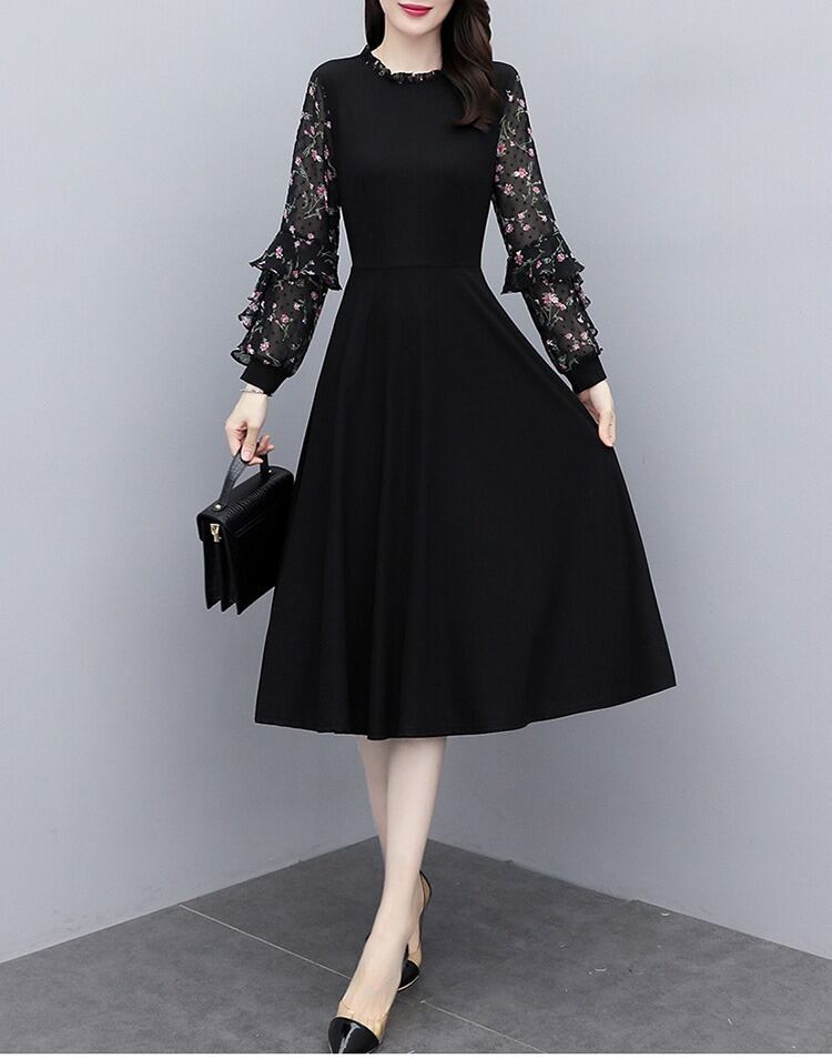 ドレス 膝丈ドレス フォーマルドレス Aラインドレス ブラックドレス ワンピースドレス ワンピドレス 膝丈 ひざ丈 袖あり パフスリーブ ラウンドネック ハイネック 襟なし Aライン フレア セミフレア シフォン フリル ウエストマーク 切り替えデザイン ドッキング 透け感 シースルー 大人可愛い きれいめ 大人 上品 おしゃれ 大人女子 クール モード系 エレガント フォーマル 抜け感 華やか 清楚 フラワー レディース M L XL 2XL 3XL 4XL 5XL 大きいサイズ 黒 ブラック