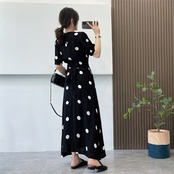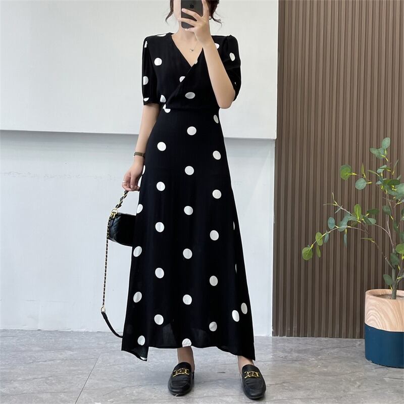 ワンピース フレアワンピース ロング ロング丈 マキシ マキシ丈 袖あり 半袖 Vネック 襟なし セミフレア 細身 Aライン ウエストマーク ウエストリボン バックリボン かわいい 大人可愛い シンプル 上品 おしゃれ こなれ感 ルーズ クール エレガント モダン とろみ感 抜け感 ドット柄 水玉 夏 レディース デート お出かけ 休日 韓国 オルチャン モテ 脚長 フリーサイズ ゆったり ゆる ワンサイズ 黒 ブラック