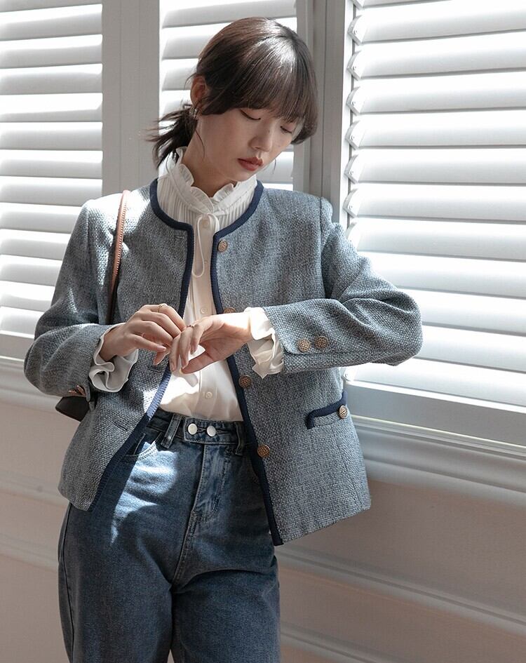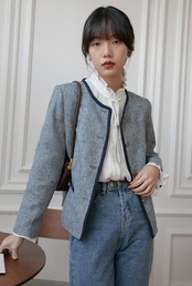 ジャケット レディース アウター ノーカラージャケット S M L XL ブルー 青 大人カラー 春 秋 長袖 ツイード パイピング ノーカラー フロントボタン ポケット ショート丈 ミドル丈 ストレート ママ フェミニン ナチュラル カジュアル きれいめ きれカジ 大人 大人可愛い こなれ感 ぬけ感 休日 お出かけ 存在感 主役級 マニッシュ スタイリッシュ クール 定番 万能 着回し 韓国 オルチャン OL オフィス 通勤 きちんと感 さわやか 清潔感 上品 エレガント ライトアウター 羽織り 王道