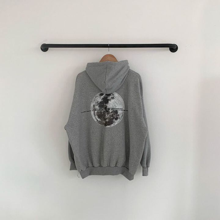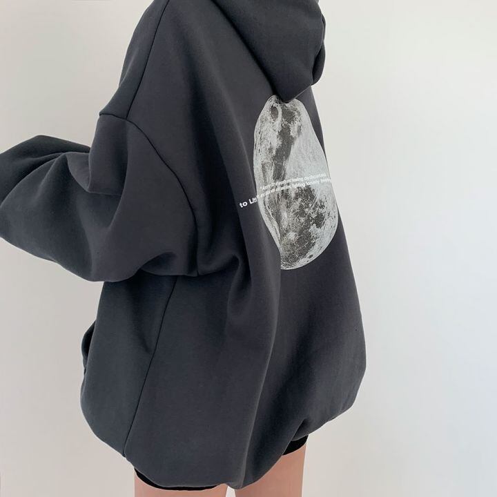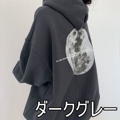 トップス パーカー バックプリント オーバーサイズ 3色 レディース 月 宇宙 長袖 フード付き ドロップショルダー 萌え袖 モノクロ 黒 ブラック グレー 灰色 ランタンスリーブ ゆったり 大きめ 体型カバー 着痩せ 細見え ストレート オシャレ お洒落 かわいい 大人可愛い シンプル カジュアル こなれ感 ラフ メンズライク かっこいい クール ボーイッシュ 春 秋 冬 ギャラクシー 10代 20代 30代 韓国 トレンド 流行 トレーナー 映え SNS お揃い 色違い 双子 個性的 個性派 ギフト