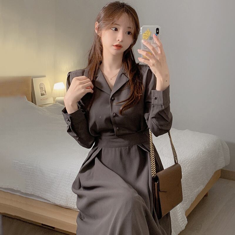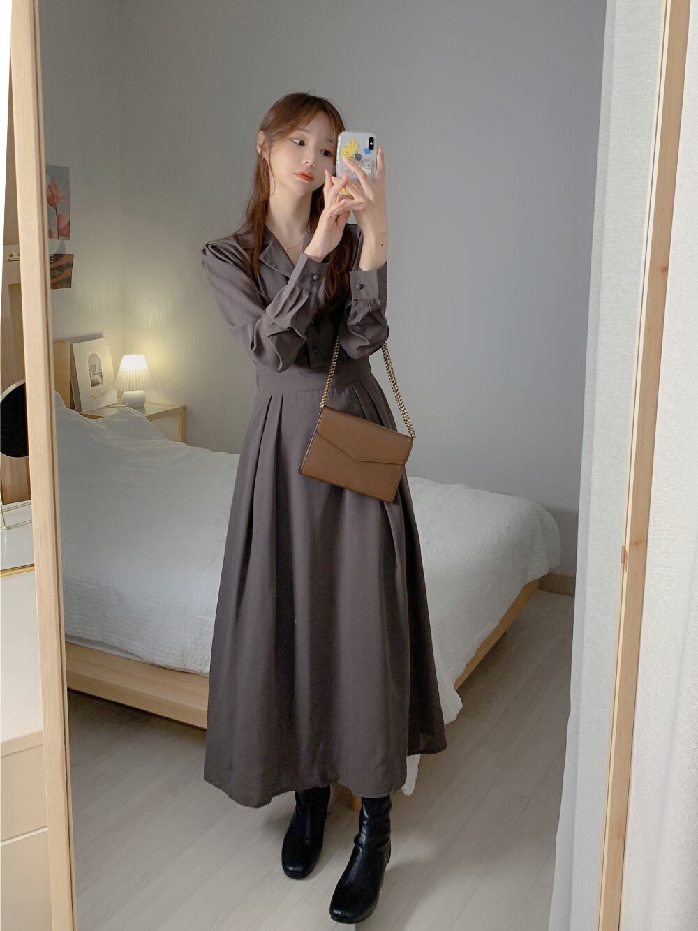 ワンピース フレアワンピース ロング丈 マキシ丈 袖あり 長袖 パフスリーブ Vネック 襟付き フレア セミフレア ウエストマーク 大人可愛い きれいめ シンプル 上品 おしゃれ お洒落 大人女子 ガーリー エレガント 主役級 存在感 無地 春 秋 10代 20代 30代 レディース 女性用 通勤 通学 デート お出かけ 女子会 休日 パーティー イベント ホテル レストラン 着回し 普段使い 韓国系 オルチャン ファッション 体系カバー 脚長 定番 S M L XL カーキ ダークブラウン