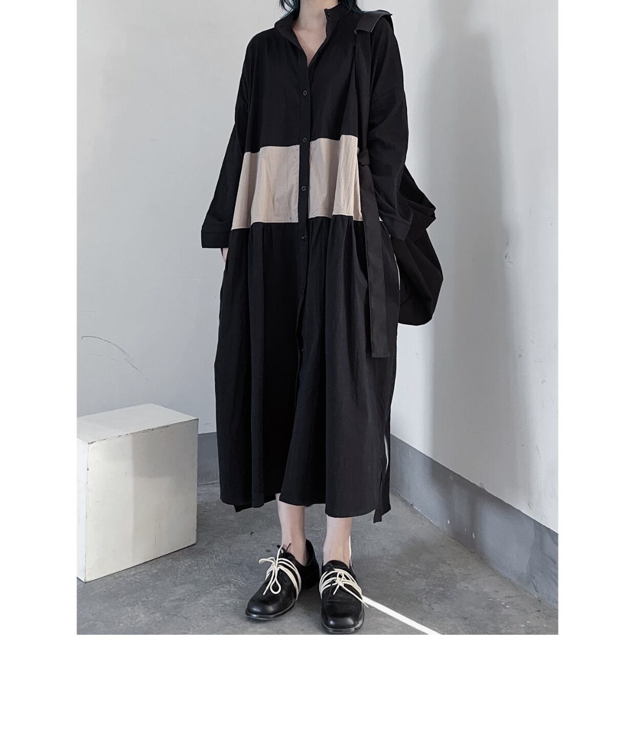 ワンピース シャツワンピース ロング丈 マキシ丈 長袖 ドロップショルダー 萌袖 スタンドカラー ハイネック フレア セミフレア ワイド サイドスリット 切り替えデザイン ポケット 前開き 綿 麻 大人可愛い シンプル カジュアル おしゃれ 大人女子 こなれ感 ルーズ 個性的 モード系 主役級 存在感 抜け感 無地 春 秋 10代 20代 30代 40代 レディース 女性用 デート お出かけ 公園デビュー 女子会 休日 旅行 着回し 普段使い 重ね着 体系カバー フリーサイズ ワンサイズ ブラック カーキ