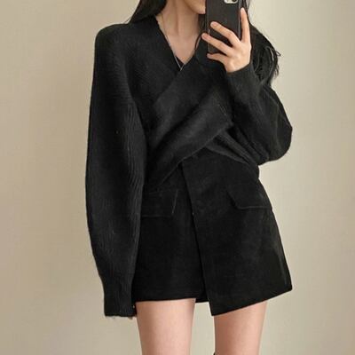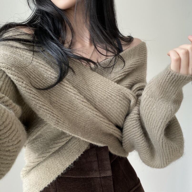 セットアップ 2点セット ニット ミニスカート 2色 レディース オフショルダー Vネック クロスデザイン レイヤード ランタンスリーブ ボリューム ハイウエスト ミニ丈 ショート丈 アシンメトリー 膝上 無地 くすみカラー ブラウン カーキ ブラック 黒 オシャレ お洒落 かわいい 大人可愛い お得 お買い得 セクシー 着回し きれいめ エレガント 春 秋 冬 ニットソー デザイン トレンド 韓国 流行 映え SNS エレガント 長袖 萌え袖 出勤 高級感 デート モテ 楽ちん シンプル カジュアル
