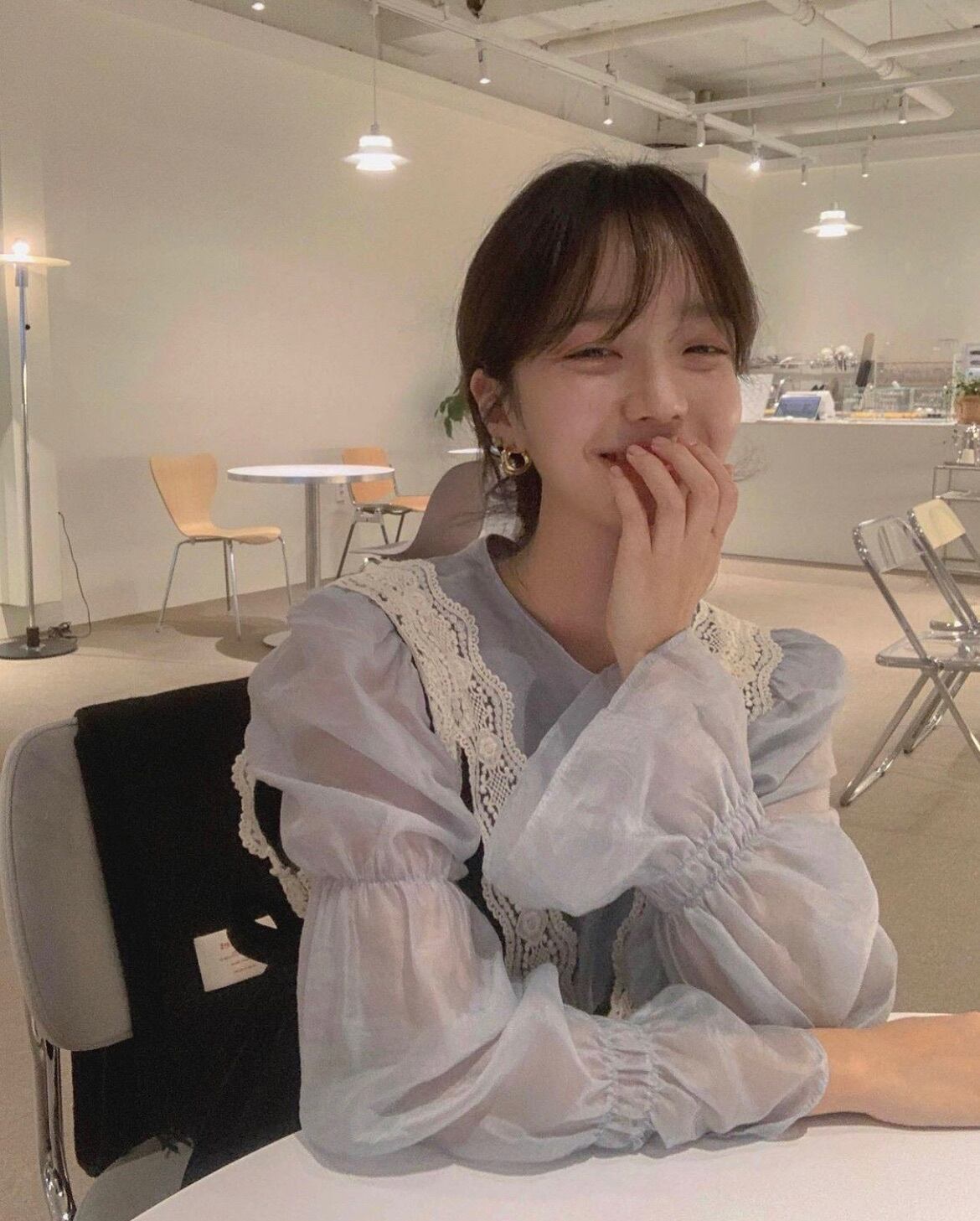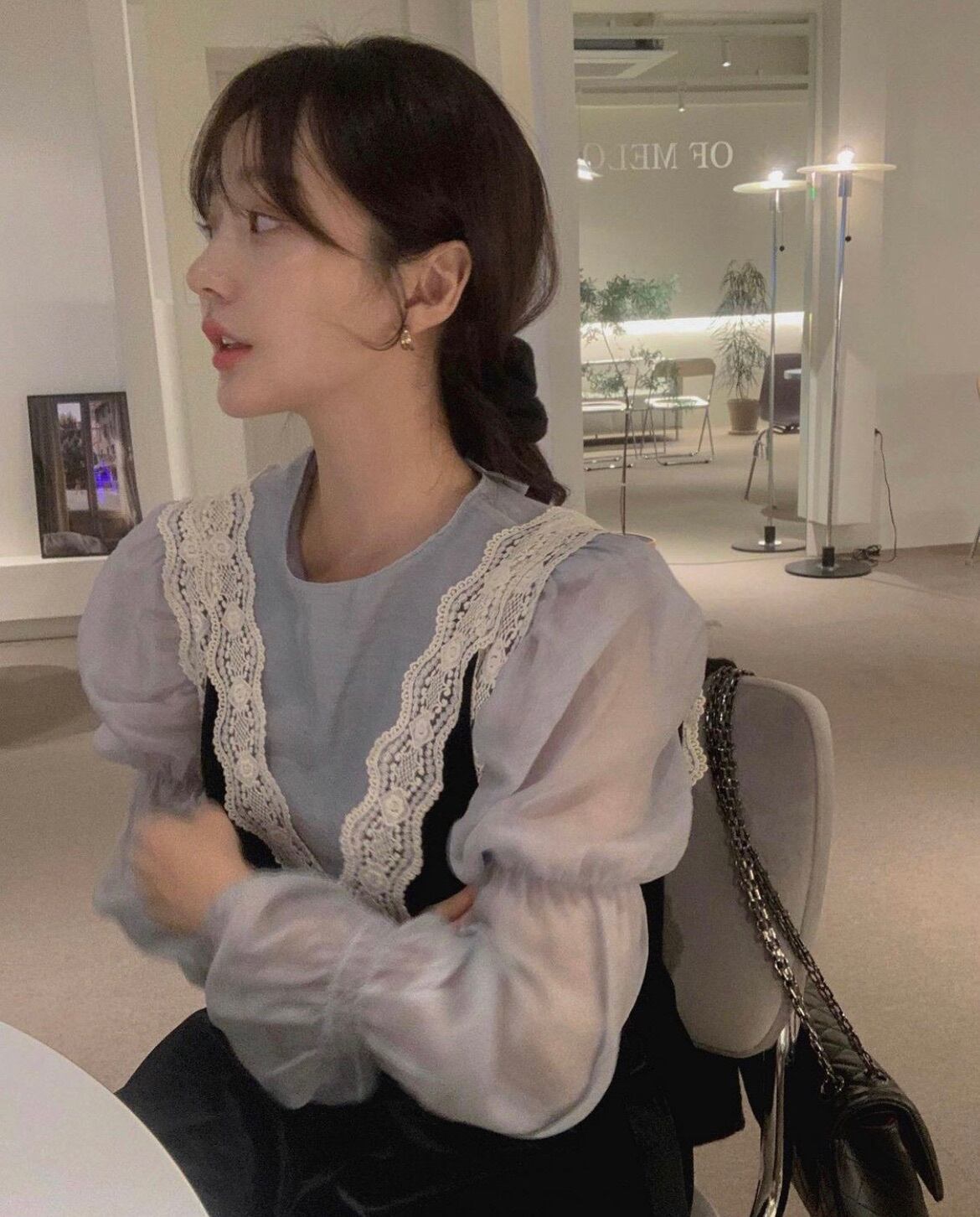 ブラウスはトレンドのボリューム袖で、背中の2段リボンがかわいい♪