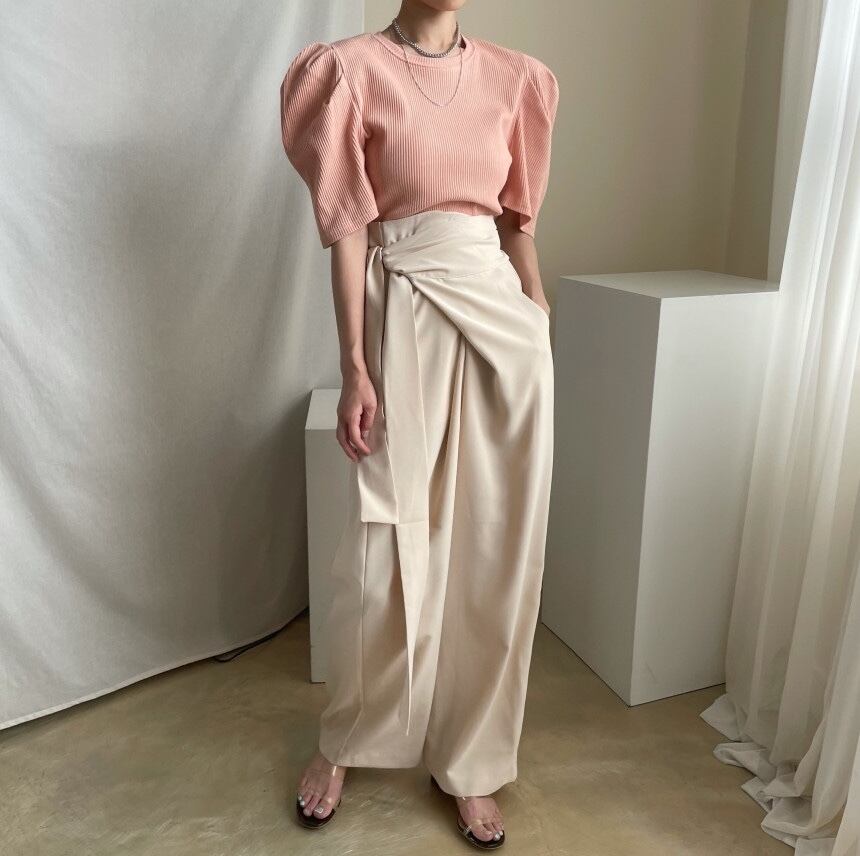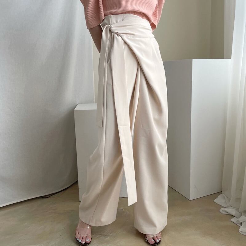 ウエストの太めリボンがアクセントのラップワイドパンツ。