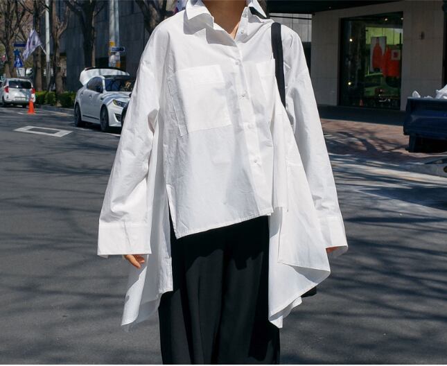 トップス シャツ ブラウス 白シャツ 白トップス 長袖 ドロップショルダー 襟付き フレア セミフレア ワイド Aライン サイドスリット ポケット 前開き 綿 大人可愛い きれいめ シンプル カジュアル おしゃれ お洒落 かっこいい 大人女子 こなれ感 ラフ ルーズ 個性的 主役級 存在感 抜け感 無地 春 夏 秋 10代 20代 30代 40代 50代 60代 レディース 女性用 デート お出かけ 女子会 休日 イベント リゾート 着回し 普段使い 重ね着 体系カバー S M L XL ホワイト