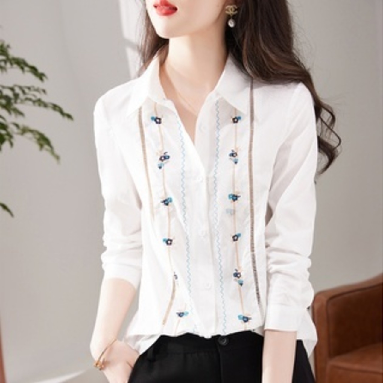 トップス ブラウス 刺繍 花柄 長袖 レディース 前開き 襟付き スタンドカラー 白シャツ ホワイト 白 レトロ エキゾチック エスニック 小花 フラワー アンティーク シンプル カジュアル ラフ こなれ感 かわいい 大人可愛い エレガント 上品 大人女子 ガーリー きれいめ 高級感 ゆったり 大きいサイズ S М L XL 2XL ОL 通勤 仕事 オフィス 普段着 着回し 普段使い 買い物 お出かけ 30代 40代 50代 体型カバー 着痩せ 入園 入学式 卒業式 シック 個性派 個性的 休日 春 秋
