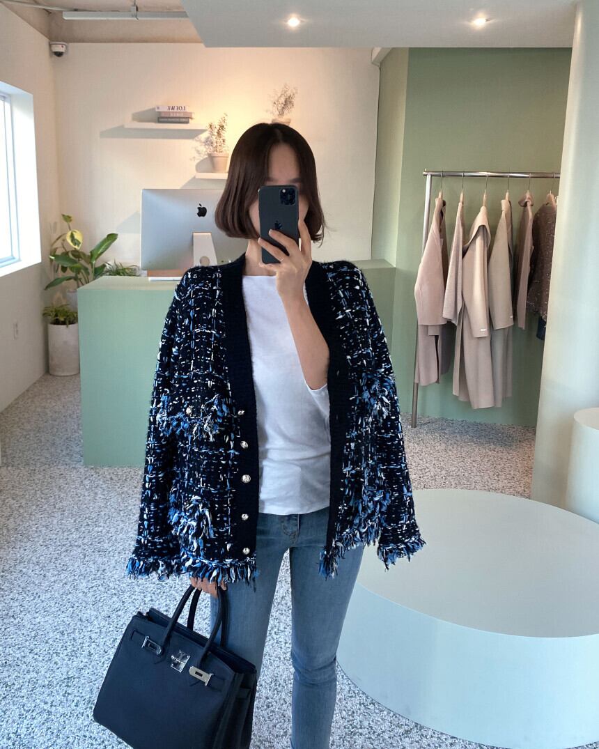 2カラバリ、ノーカラーツイードジャケットカーディガン。