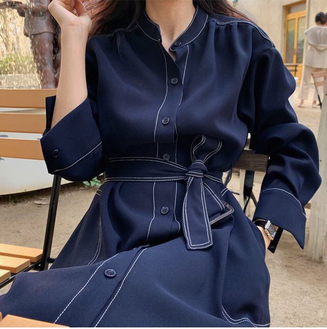 アウター レディース コートワンピース シャツワンピース ライトアウター 長袖 スタンドカラー 立ち襟 フレア Aライン ステッチ ボタン ポケット ウエストベルト バックスリット 2WAY 前開き 大人可愛い きれいめ シンプル かっこいい 大人 上品 おしゃれ お洒落 大人女子 メンズライク マニッシュ クール エレガント 存在感 抜け感 S M L 紺 ネイビー 無地 春 秋 10代 20代 30代 40代 50代 60代 ママ オフィス ビジネス OL 通勤 学生 通学 デート お出かけ 女子会