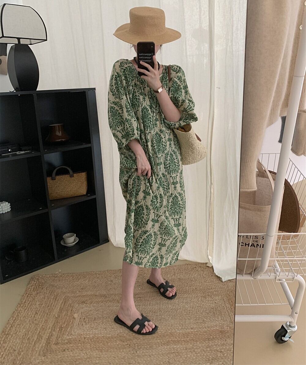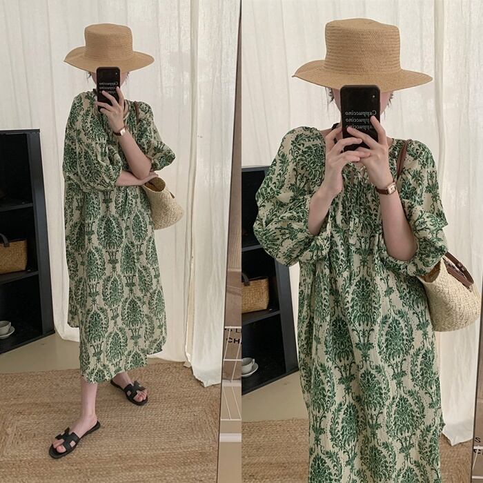 ワンピース レディース ロングワンピース S M L グリーン 緑 総柄 ボタニカル 葉 植物 大人カラー くすみカラー アースカラー 春 夏 ラウンドネック 半袖 パフスリーブ ランタンスリーブ ボリューム袖 ロング丈 ロング ミモレ丈 膝下 フレア Aライン ルーズ ゆったり ゆる ふんわり 体型カバー 着やせ ママ マタニティ フェミニン カジュアル きれいめ きれカジ ナチュラル 大人 大人可愛い 上品 存在感 主役級 リゾート エスニック アジアン エレガント 韓国 オルチャン さわやか