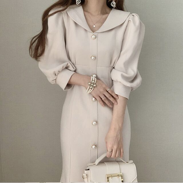 ワンピース レディース マーメイドワンピ ドレス S M L ブラック 黒 アプリコット 春 秋 7分袖 七分袖 パフスリーブ Vネック 襟付き タック パールボタン マーメイドライン 美ライン 美シルエット 裾フレア ロング丈 ロング ミモレ丈 膝下 ハイウエスト 脚長 スタイルアップ フェミニン ナチュラル きれいめ きれカジ カジュアル モテ ガーリー キュート 大人 大人可愛い 存在感 主役級 こなれ感 ぬけ感 デート お出かけ お呼ばれ クラシカル きちんと感 上品 シック 韓国 オルチャン