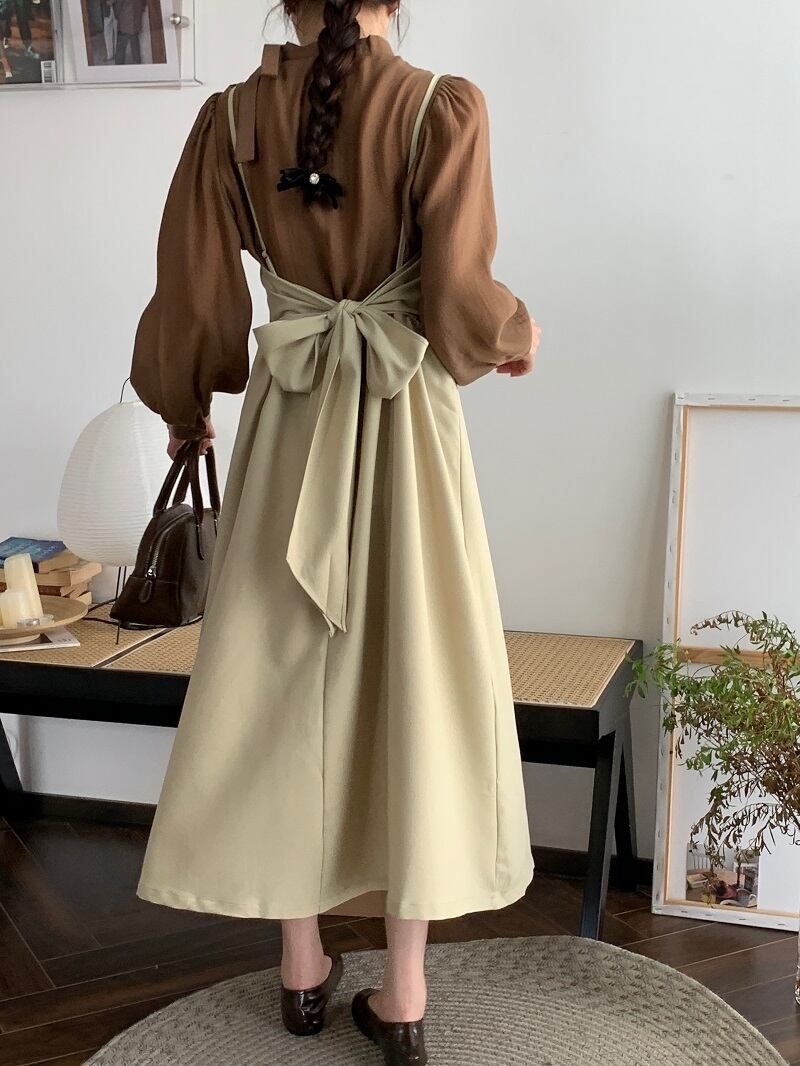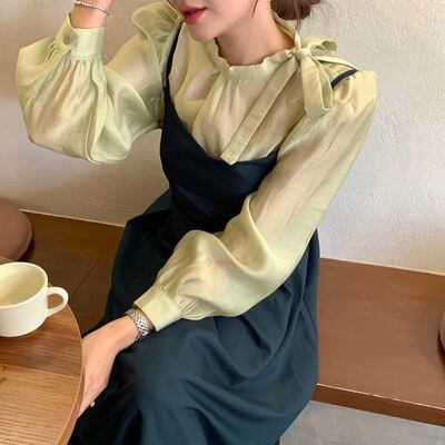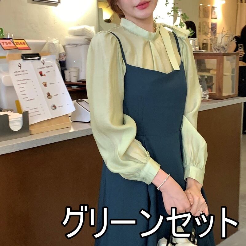 セットアップ 上下セット ワンピース ブラウス 3色 レディース 長袖 シフォン 透け感 リボン パフスリーブ ボリューム 薄手 キャミワンピース ロングワンピース Aライン タイト スリム ふんわり ロング丈 ミモレ丈 無地 くすみカラー かわいい 大人可愛い 上品 きれいめ エレガント 清楚 お得 お買い得 お洒落 オシャレ 韓国 トレンド 流行 シック ヴィンテージ レトロ バックデザイン リボン ブラウン 茶色 緑 グリーン ブラック 黒 ホワイト 白 春 秋 着回し 重ね着 こなれ感