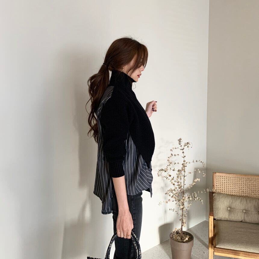 2色カラバリ、ハイネックニットとストライプ長袖シャツのドッキングトップス。