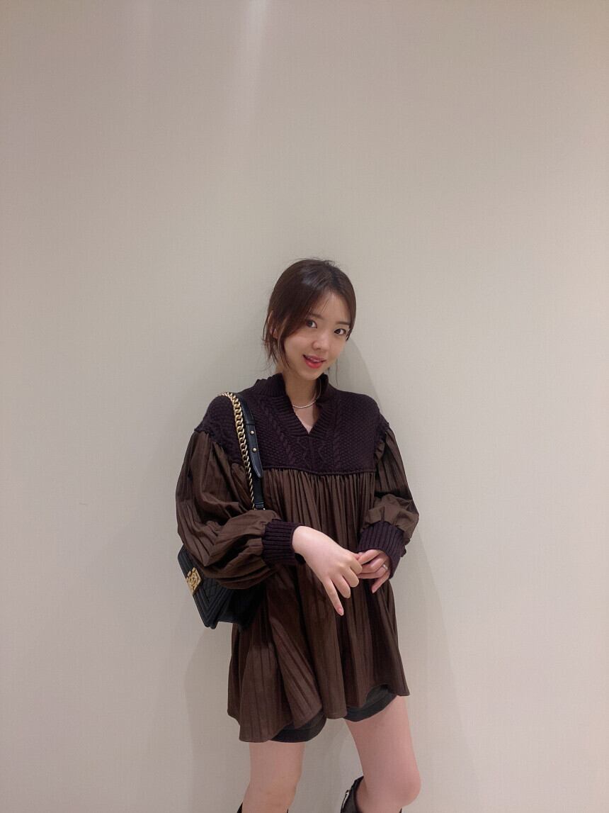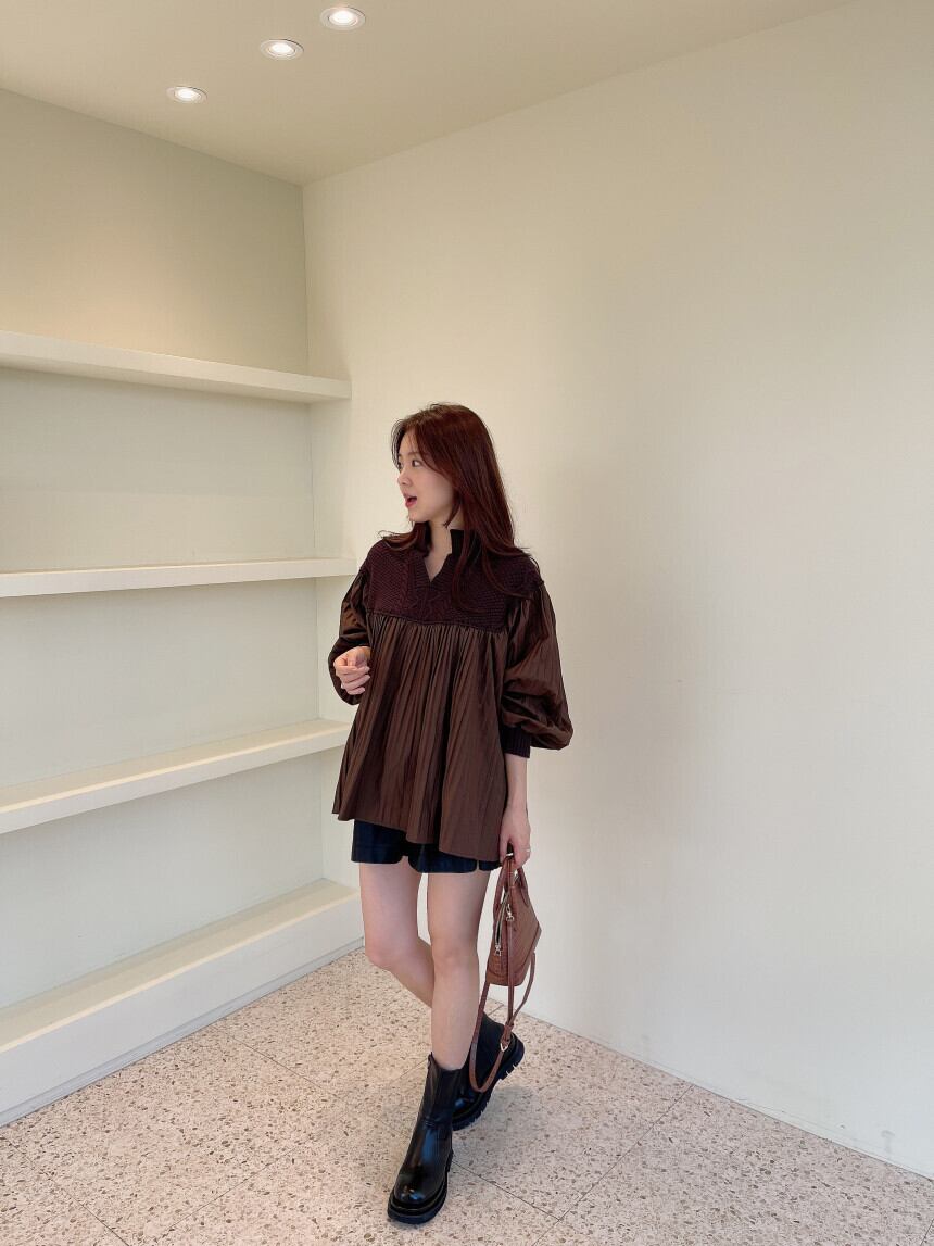 2色カラバリ、ケーブルニットとプリーツシャツという異素材ミックストップス。