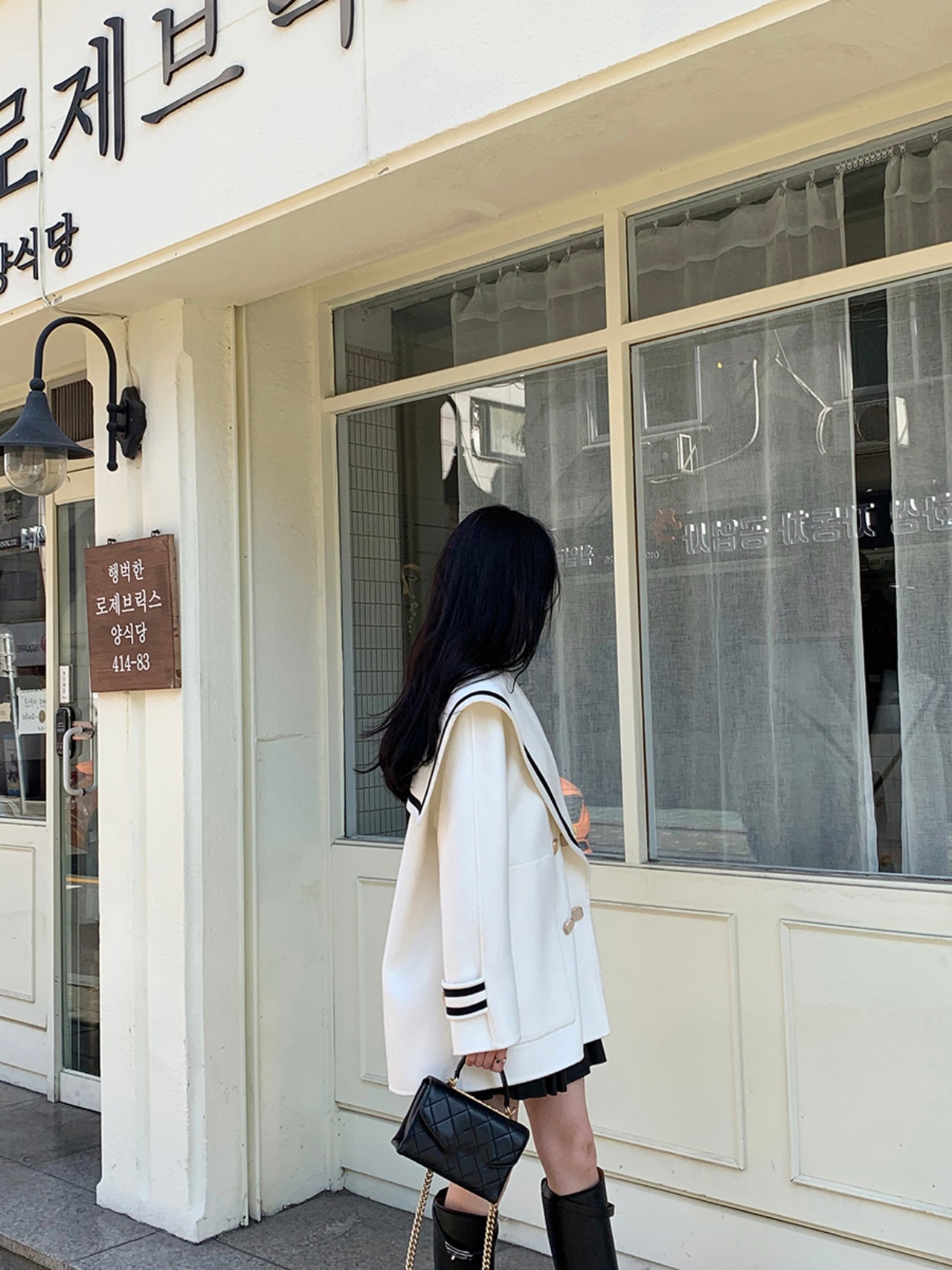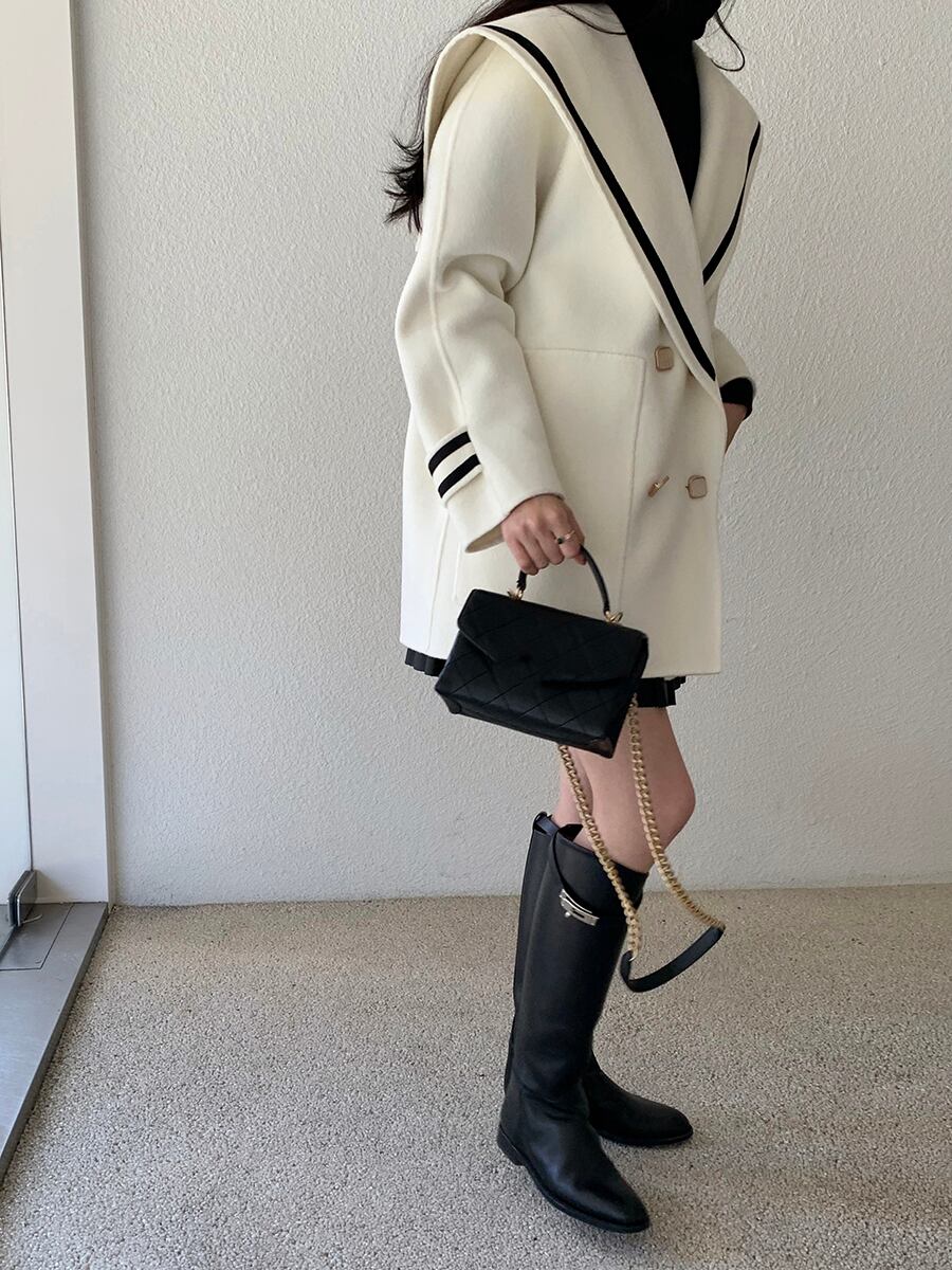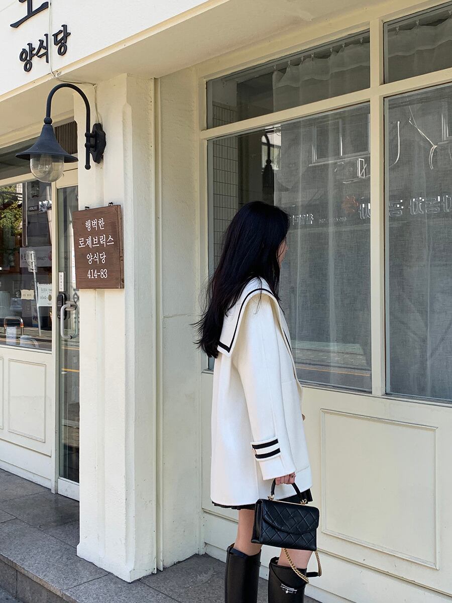 大きなセーラーカラーが印象的なコート。