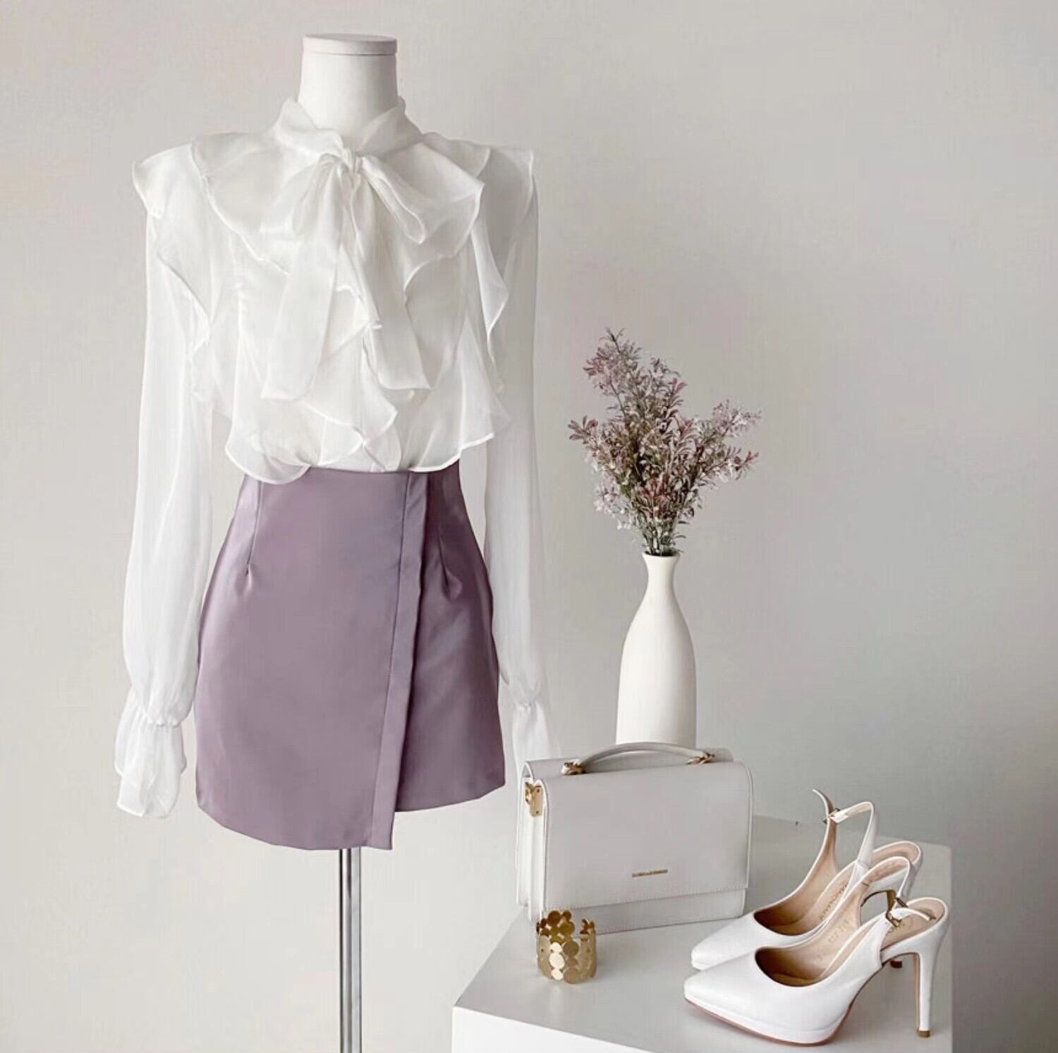 ブラウス レディース トップス シャツ S M L XL ホワイト 白 グレーブルー 青 灰色 シースルー 透け感 無地 春 秋 ボウタイ フリル 長袖 シアースリーブ ショート丈 ミドル丈 ストレート ママ フェミニン ナチュラル カジュアル きれいめ きれカジ 大人 大人可愛い こなれ感 ぬけ感 存在感 主役級 休日 お出かけ デート お呼ばれ 女子会 華やか ガーリー モテ キュート シンプル 定番 万能 着回し 王道 学生 通学 韓国 オルチャン 上品 エレガント シック ロマンチック モード
