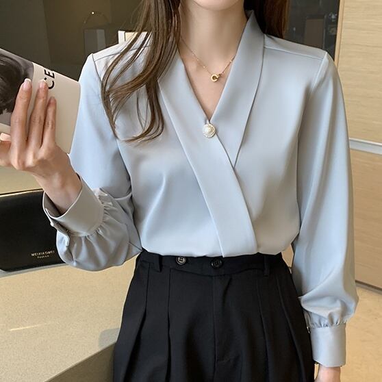 トップス ブラウス パール ボタン Vネック 長袖 レディース きれいめ 上品 エレガント 大きいサイズ 大きめ S М L XL 2XL ブルー 青 水色 くすみカラー お洒落 オシャレ かわいい 大人可愛い 20代 30代 40代 50代 大人カラー 着回し シンプル カジュアル ОL オフィス 通勤 仕事 普段着 普段使い ゆったり 体型カバー 着痩せ 細見え Iライン ストレート フォーマル 柔らか 抜け感 とろみ 入園 入学式 卒業式 卒園式 披露宴 結婚式 二次会 清楚 知的