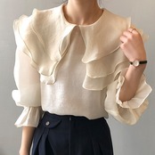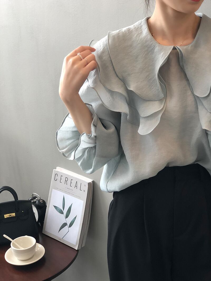トップス ブラウス ビッグカラー 襟 フリル 長袖 レディース ボリューム カットソー 透け感 エレガント 上品 清楚 高級感 きれいめ かわいい 大人可愛い ガーリー フェミニン カジュアル お洒落 オシャレ ゆったり 体型カバー 着痩せ 白 ホワイト グレー 灰色 無地 韓国 トレンド 流行 春 夏 秋 量産型 姫系 ロリータ レトロ ヴィンテージ アンティーク 20代 30代 40代 着回し 重ね着 デート 女子会 モテ 映え とろみ 抜け感 こなれ感 映え SNS 華奢 清潔感 フェミニン