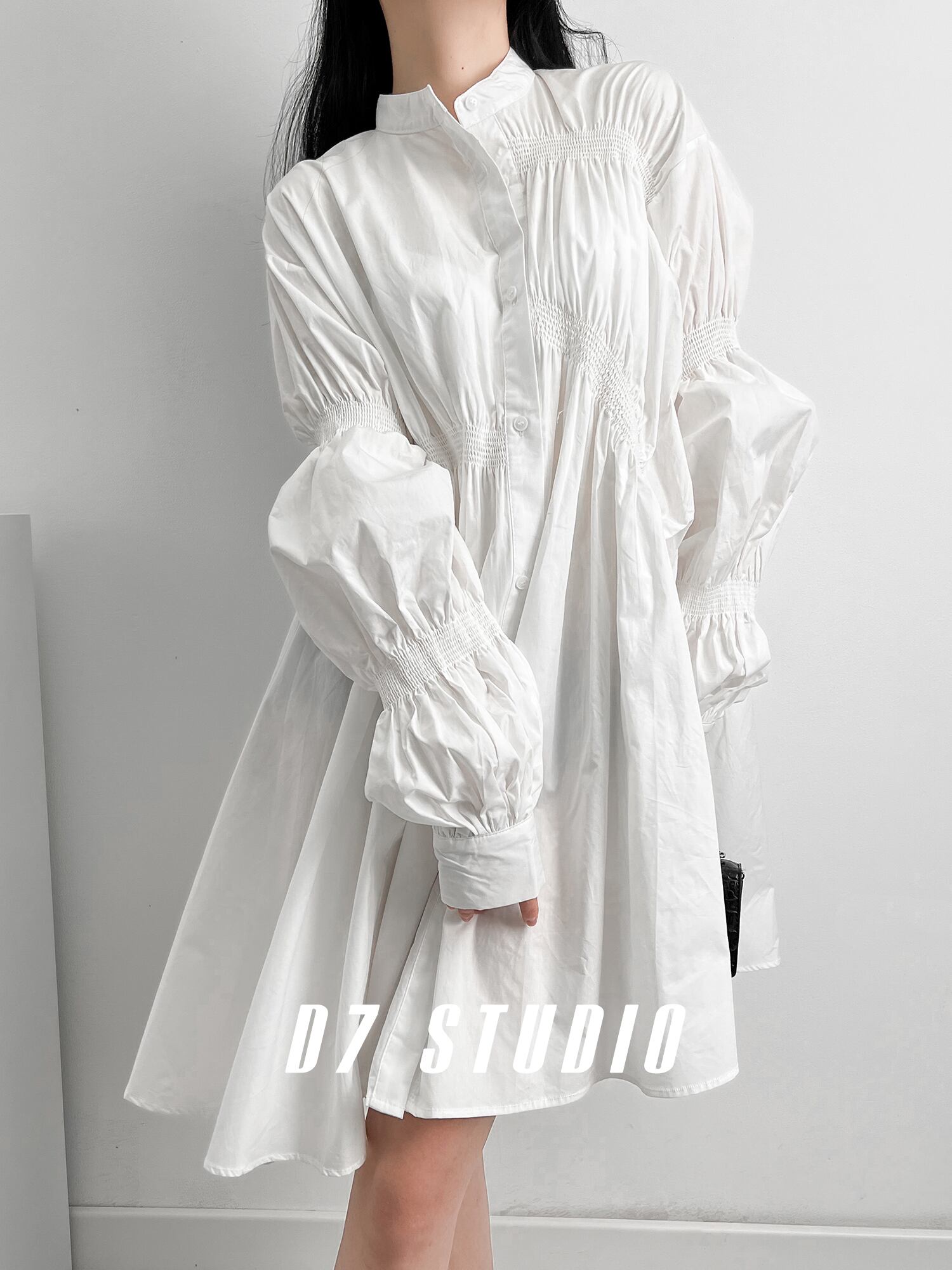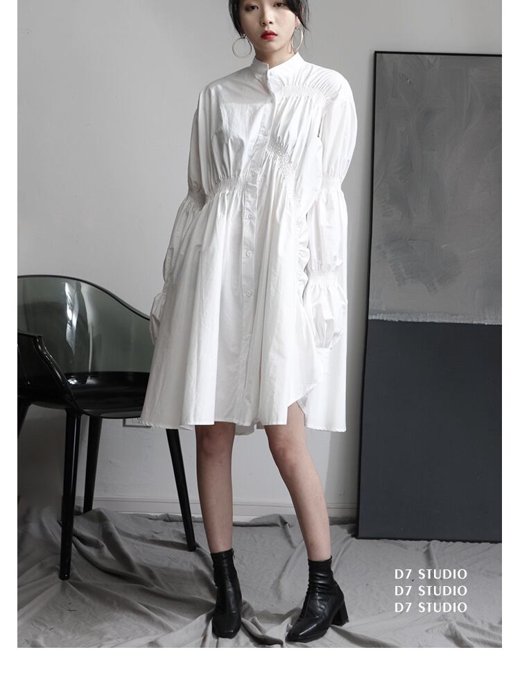 ワンピース 白シャツ シャツワンピース 膝丈 ひざ丈 袖あり 長袖 萌袖 ランタンスリーブ 襟なし セミフレア Aライン 前開き ふんわり 綿 かわいい 大人可愛い カジュアル おしゃれ お洒落 大人女子 こなれ感 ラフ ラブリー キュート ガーリー ルーズ 個性的 モード系 主役級 存在感 抜け感 無地 春 秋 10代 20代 30代 レディース 女性用 デート お出かけ 女子会 休日 リゾート 旅行 ホテル レストラン 着回し 普段使い 重ね着 韓国系 オルチャン ファッション フリーサイズ ホワイト