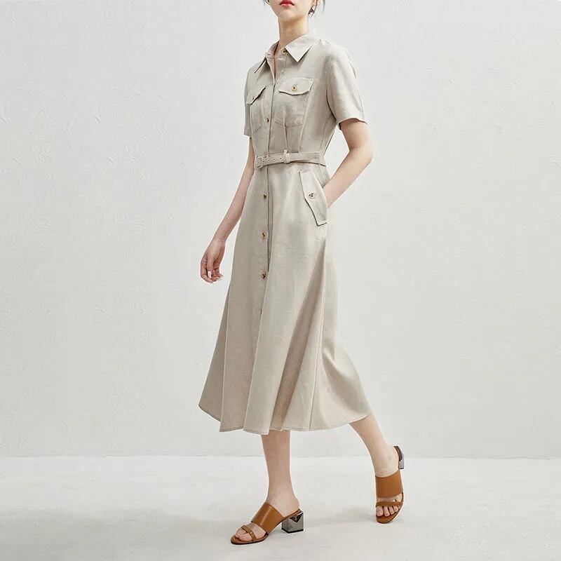夏 リネン ワンピース ワンピース ミディスカート シャツスカート ワンピドレス 袖あり 半袖 Vネック 襟付き スリム Aライン シングルブレスト レギュラー ベルト ポケット 前開き ボタン タイプA ルーズウエスト 綿 異素材MIX かわいい 大人可愛い シンプル カジュアル おしゃれ かっこいい スポーティー モダン 無地 夏 レディース 女性用 OL 通勤 学生 通学 デート 女子会 リゾート ガーデン 着回し インスタ映え M L XL 2XL 3XL アプリコット ダークブルー キャラメル