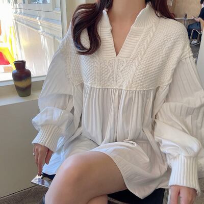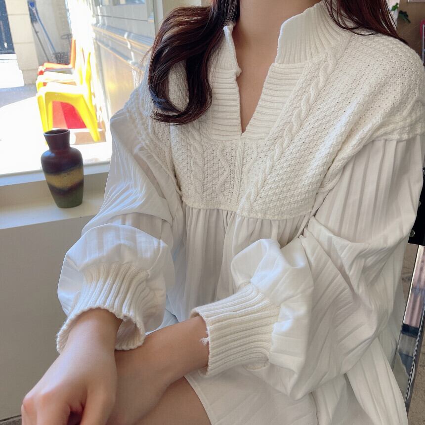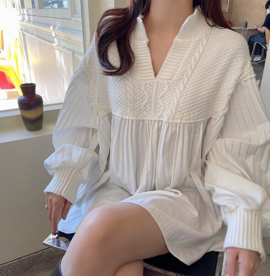 ニット ブラウス チュニック 切り替え ドッキング 長袖 レディース オーバーサイズ Vネック プリーツ ボリューム カットソー エレガント 上品 清楚 高級感 きれいめ かわいい 大人可愛い ガーリー フェミニン カジュアル お洒落 オシャレ ゆったり 体型カバー 着痩せ 白 ホワイト ブラウン 茶色 無地 韓国 トレンド 流行 春 秋 20代 30代 40代 50代 マタニティ ママ 妊婦 着回し 重ね着 デート 女子会 モテ 映え とろみ 抜け感 こなれ感 映え SNS 華奢 リブニット